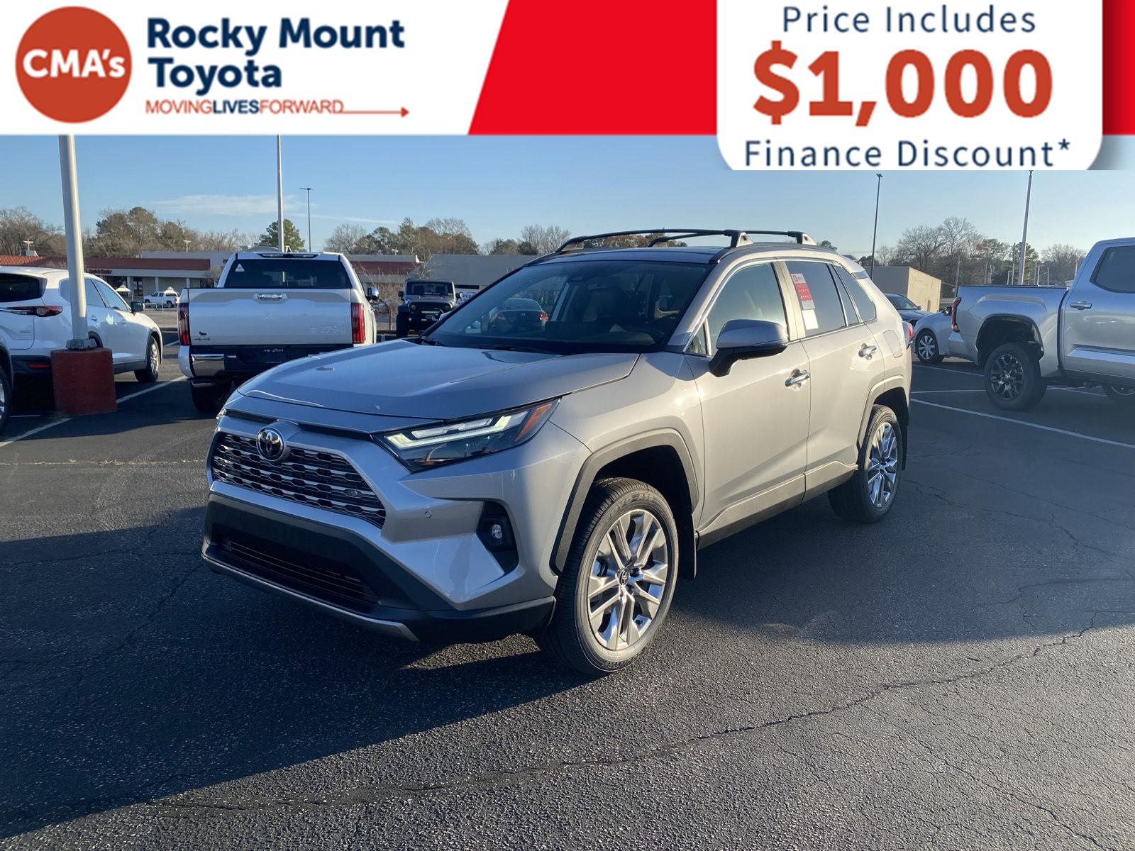 Thank you for choosing CMA's Rocky Mount Toyota, this Silver Sky Metallic 2025 Toyota RAV4 Limited is a great choice! City27/HWY 35. Silver Sky Metallic, Black, SofTex seat trim. All prices include $1,000 dealer finance discount applied. All other discounts taken off of dealer added accessories before T, T, L, and doc fee. Must finance all New Toyota's through SETF with dealer or the discount will be added back to the overall price. Outside liens and cash deals do not qualify. All vehicles are sold on a first come first serve basis due to multiple people interested in the same vehicles without prior knowledge. Pricing Info Good Today Through Close of Business. Pricing excludes dealer added accessories. Premium Safety Package before finance discount is a minimum of $1,999.00.