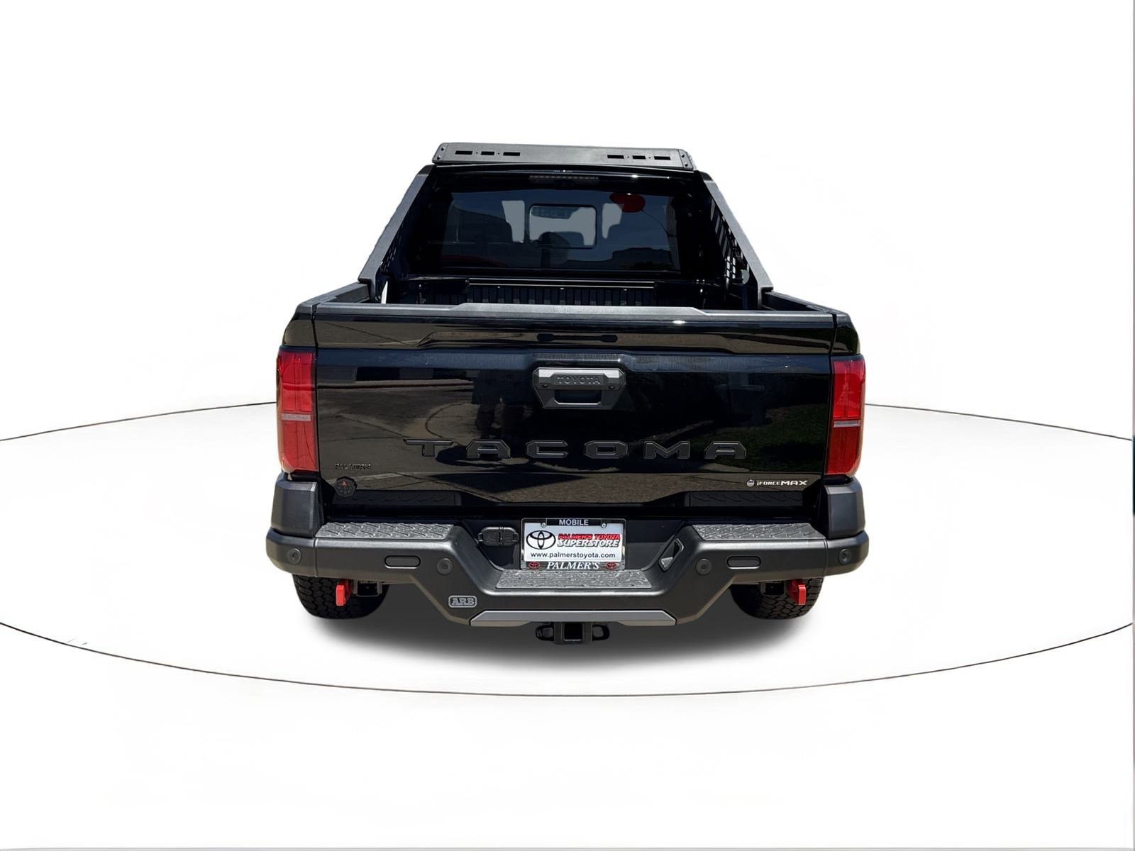 Black 2025 Toyota Tacoma Hybrid Trailhunter 4WD 8-Speed Automatic 2.4L I4 PDI Hybrid Turbocharged DOHC 16V, 3.583 Axle Ratio, 4-Wheel Disc Brakes, 9 Speakers, ABS brakes, Air Conditioning, Alloy wheels, AM/FM radio: SiriusXM, Anti-whiplash front head restraints, Apple CarPlay/Android Auto, Auto High-beam Headlights, Auto-dimming Rear-View mirror, Automatic temperature control, Brake assist, Bumpers: body-color, Driver door bin, Driver vanity mirror, Dual front impact airbags, Dual front side impact airbags, Electronic Stability Control, Emergency communication system: Safety Connect (1-year trial), Exterior Parking Camera Rear, Four wheel independent suspension, Front anti-roll bar, Front Bucket Seats, Front Center Armrest, Front dual zone A/C, Front fog lights, Front reading lights, Fully automatic headlights, Garage door transmitter: HomeLink, Heads-Up Display, Heated & Ventilated Front Bucket Seats, Heated door mirrors, Heated front seats, Heated steering wheel, Illuminated entry, JBL Premium Audio, Knee airbag, Leather Shift Knob, Leather steering wheel, Low tire pressure warning, Navigation system: Drive Connect (1 year trial) includes Cloud Navigation with real time traffic and Google POI, Occupant sensing airbag, Outside temperature display, Overhead airbag, Overhead console, Panic alarm, Passenger door bin, Passenger vanity mirror, Power door mirrors, Power driver seat, Power passenger seat, Power steering, Power windows, Radio: 14 Toyota Audio Multimedia, Rear anti-roll bar, Rear step bumper, Rear window defroster, Remote keyless entry, Security system, SofTex Seat Trim, Speed control, Speed-sensing steering, Split folding rear seat, Steering wheel mounted audio controls, Tachometer, Telescoping steering wheel, Tilt steering wheel, Traction control, Trip computer, Turn signal indicator mirrors, Variably intermittent wipers, Ventilated front seats.