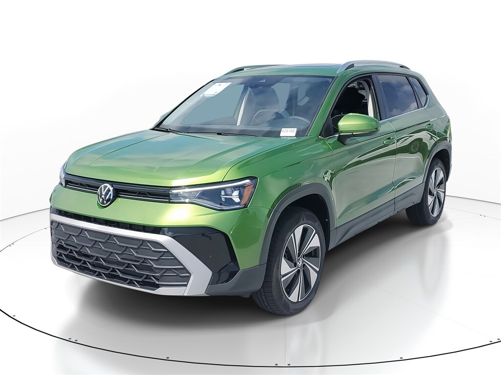 The 2025 Volkswagen Taos 1.5T SE AWD is a new SUV with a turbocharged 1.5L I4 engine and a host of advanced features. It offers a comfortable interior with seating for five, a smooth automatic transmission, and all-wheel drive for enhanced traction. The exterior is a Bright Moss Green Metallic, complemented by a black interior. The vehicle is designed for efficiency and safety, with features like automatic temperature control, a panoramic sunroof, and advanced driver assistance systems.