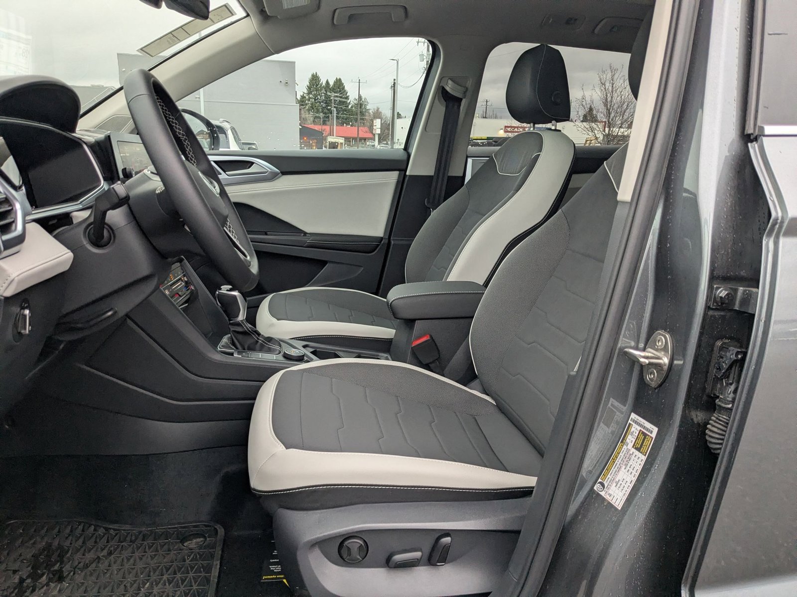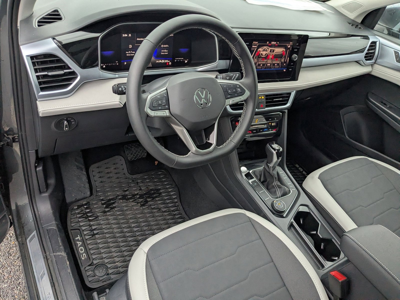 The 2025 Volkswagen Taos 1.5T SE is a new all-wheel drive SUV with a turbocharged I-4 engine and a comfortable interior for five. It features a smooth automatic transmission, advanced safety features, and a spacious cargo area. The Platinum Gray Metallic exterior is complemented by a black interior, and the vehicle is equipped with a panoramic sunroof, heated front seats, and a suite of connectivity options.