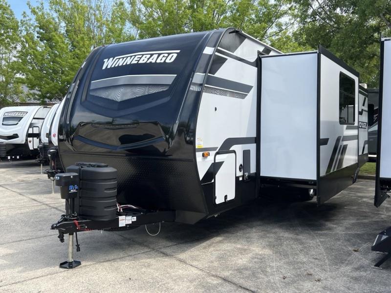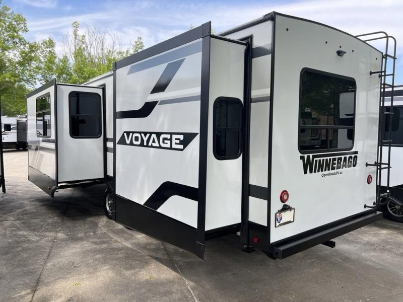 Winnebago Voyage travel trailer 3235FK highlights: Walk-Through Bath, Queen Bed Slide Out, Front Kitchen, Booth Dinette, Electric Awning with LED Lights. Step inside this dual entry travel trailer for a world of comfort! The rear master bedroom includes its own exterior entry door, a queen bed slide out with an optional king bed, dual nightstands, and even a bedroom fireplace! You will find a spacious walk-through bath that leads to the living area with a tri-fold sofa slide out that also houses two end tables and the 15 cu. ft. 12V refrigerator. The chef of your group will love the front kitchen with ample counter space, a recessed three burner cooktop, plus a 30" over-the-range convection microwave. A booth dinette provides a place to dine together, or you can take your plate outdoors to sit under the electric awning with LED lights! Each Voyage travel trailer by Winnebago includes a 200-watt solar panel with a 30 amp-charge controller and resettable breaker so you can camp off-grid. Also included is a heated and enclosed underbelly with radiant foil insulation for four seasons of travel, 2" thick fiberglass sidewalls and a painted gel coat front cap with integrated LED lighting, a walk-on roof, plus power stabilizers for easy setup and stability. The interior offers many comforts of home, large windows, LED ceiling lights, ductless flooring throughout, and full kitchen amenities. No voyage is better than the one taken in a Voyage travel trailer! Come choose your model today!