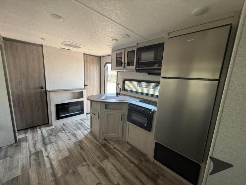 CrossRoads Zinger Lite travel trailer ZR290QB highlights: Large Slide Out, Front Private Bedroom, Rear Private Bunkhouse, Full Bath, Fireplace. The whole gang will love camping in this spacious travel trailer for nine! There is a rear private bunkhouse with set of bunk beds plus a third bunk over the jack sofa, a mat under the sofa for even more sleeping space, and a dresser to keep this room tidy. You'll have the front private bedroom all to yourselves which includes an RV queen bed and dual shirt closets. In the morning, everyone can meet in the combined kitchen and living area that includes an 80" booth dinette and jack knife sofa within the large slide out, full kitchen amenities, and an entertainment center with a fireplace to make it feel more like home. And the full bath is another plus when camping! Join the CrossRoads family with a Zinger Lite travel trailer! You'll enjoy an abundance of standard features you would usually find with higher priced travel trailers. Each model features a Super Flex Alpha Roof and front diamond plate for added strength and durability. There is also an electric awning outdoors, along with pass-through storage, rear ladder prep, and a tankless on-demand water heater for added convenience. The interior features pleated shades/mini blinds/fabric window treatments, a 12V refrigerator, comfortable seating and seating spaces, plus plenty of storage for your personal belongings and camp gear!