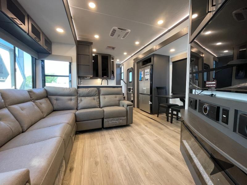 Alliance RV Valor toy hauler 44V14 highlights: Loft, Bath and a Half, Fireplace, Dual Entry Doors, Roll-Over Sofas, 14' Garage. The whole gang will love camping in this toy hauler with a 14' garage for your toys and gear. Once you have arrived at your destination, you can set up the HappiJac roll-over sofas with a queen bed above them, and also a loft which opens to the garage area as well. A half bath is also available off the garage which is an added convenience for those sleeping in this converted area, and for those coming in off the trail so that they do not have to track all through the main unit to use the bathroom. The chef can prepare great meals for their hungry crew with the fully equipped kitchen including a four burner cooktop, a 17 cu. ft. stainless steel 12V refrigerator, large sink, and plenty of countertop prep space. The rest of the gang can be relaxing on the large L-shaped sofa slide watching the 50" HDTV and enjoying the fireplace, or playing a game of cards at the dining table with four chairs. The front private bedroom features a king bed slide for more interior space, a flip top dresser for all of your belongings, and a front wardrobe with washer and dryer prep, plus it has an entrance into the dual entry bathroom! You can bring your toys with you wherever you go with any one of these Alliance RV Valor toy hauler fifth wheels! They are adventure-ready with a quality build from the walk on roof with seamless PVC roof covering to the commercial grade vinyl flooring and MorRyde CRE3000 suspension system. The Performance Running Gear package comes with a 101" wide-body benchmark chassis platform, 7,000 lb. Dexter axles, and a space enhancing drop frame storage compartment to pack in all your riding gear. You can even go off-gridding thanks to the Off the Grid Pack that has two 400 watt solar panels, generator prep, a 40 amp charge controller, and a 100 amp hour lithium iron phosphate battery. Some of the interior comforts you will enjoy are the hardwood cabinet doors and drawers, solid surface kitchen countertops, and commercial grade vinyl flooring with no carpet to make clean up a breeze. The Valor toy haulers are also the Master of 12 Volt with USB charging station throughout, a stainless steel refrigerator, and more 12 volt features to make camping hassle-free! Bish’s RV - Meridian, Idaho has a huge selection of Travel Trailers, Fifth Wheels, Pop Up Campers, Truck Camper’s, Toy Haulers, Class A Motorhomes, Class B Camper Vans, and Class C Motorhomes. All these RVs are priced to sell. Be sure to ask about our “Purchase with Confidence Guarantee” to ensure you are receiving the best RV buying experience in Meridian and surrounding areas like Boise, Nampa, & Caldwell. Affordable prices on all new and used RVs only at Bish’s RV of Meridian.