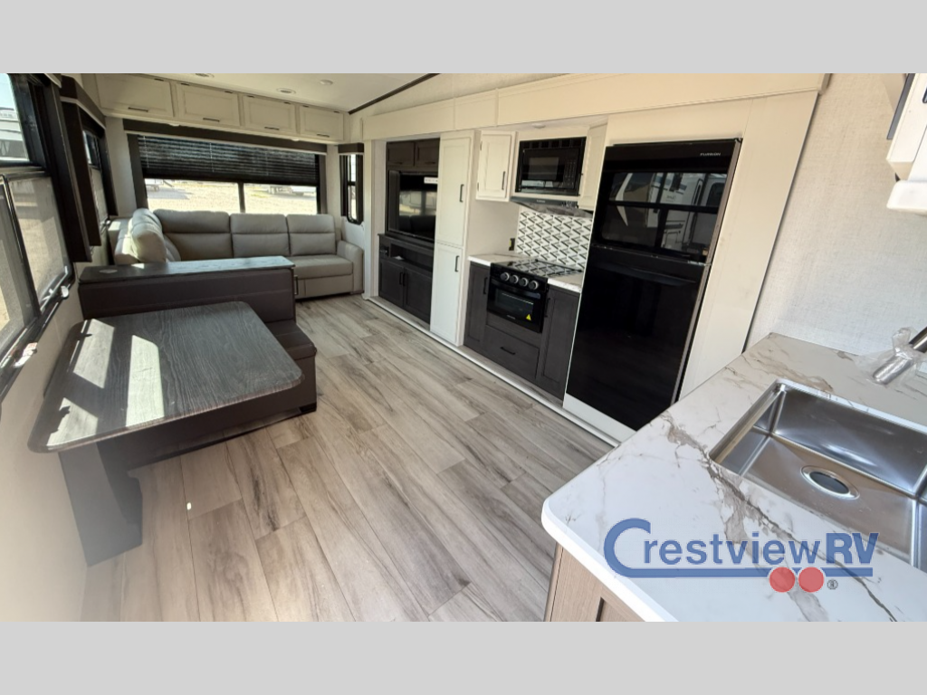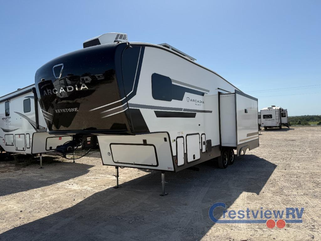 Keystone Arcadia Select fifth wheel 28SLS highlights a spacious living area with a tri-fold sofa and sofa with recliners, perfect to rest while enjoying your tour favorites shows in the fabulous entertainment center. You can cook like a Michelin star chef in the incredible kitchen, fitted with a convection microwave, refrigerator, and three-burner range. Also, the overhead cabinets and pantry will allow you to keep all your food and spices organized on the go, and when your meal is done, you can enjoy it in the comfortable dinette. Convenience is our top priority; that is why the full bathroom is equipped with everything needed to take a nice shower. Finally, retreat to the comfortable queen bed, ideal for a deserved good night's rest. With any Arcadia Select fifth wheel by Keystone you will enjoy easy towability and at-home comforts at an affordable price! The laminated sidewalls with five sided aluminum superstructure will provide a strong foundation so you can enjoy your RV for years to come, plus a one-piece, heated and enclosed polypropylene underbelly means you can camp year around! And an upgraded Roto-Flex hitch pin will make it easy to tow. Head inside to find tall slides for added space, seamless, pressed countertops, convenient underbed storage, and a large shower with a retractable door and skylight. These fifth wheels also include a Blade Pure A/C system, Girard on-demand tankless water heater, two 30 lb. LP tanks, and more utilities to make your camping experience run smoothly.