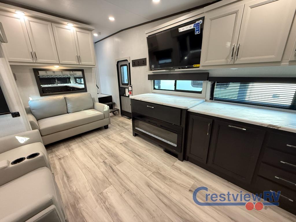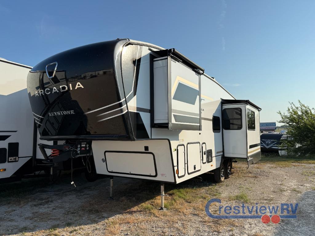 Keystone Arcadia Super Lite fifth wheel 260SLCL highlights: Rear Kitchen. You're sure to love every minute spent in this rear kitchen fifth wheel! There is generous counter space to prep your best meals plus a pull-out dinette table where you can dine together. Additional seating space can be found on the theater seating and hide-a-bed sofa slide out. There is even a fireplace to make this space more cozy. If you enjoy spending time outdoors, there is a Grill-N-Chill outdoor kitchen, 19' power awning, and LCI solid steps. When it's time to call it a night, the queen bed in the private bedroom is sure to be calling your name! With any Arcadia Super Lite fifth wheel by Keystone, you will enjoy easy-to-tow lengths, unmatched storage, and oversized windows to let the outdoor views in. The structural I-beam frame will provide a strong foundation to your RV, and the Curt Performance Package means you can enjoy hassle-free towing. You will be able to camp year around thanks to the Peak Weather Package that includes a heated and enclosed underbelly, a 35K BTU furnace, and Keystone's exclusive HyperDeck floor that adds an additional layer of insulation to your floor. The interior will make you feel at home with residential hardware, seamless pressed countertops, black roller shades, and ample storage space. Sometimes the best things come in smaller packages; choose a Arcadia Super Lite today!