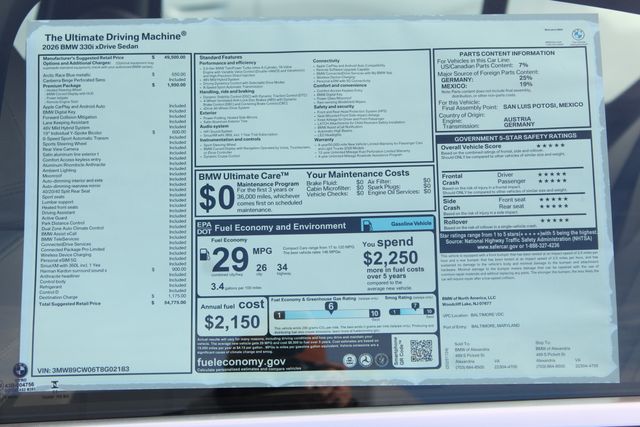 Arctic Race Blue Metallic 2026 BMW 3 Series 330i xDrive AWD 8-Speed Automatic Sport 2.0L 4-Cylinder DOHC 16V Turbocharged AWD. Recent Arrival! 26/34 City/Highway MPG. Unless specifically indicated in the advertisement, MSRP does not include taxes, fees or other charges. Actual dealer pricing may vary. Consult your dealer for more information and complete details. The dealer advertised price may not reflect specific dealer offers, and may be subject to certain terms and conditions as indicated in the advertisement. Consult your dealer for more information and complete details. Images and options shown are examples, only, and may not reflect exact vehicle color, trim, options, pricing or other specifications. Effective May 1st 2024, the Destination and Handling charge for all BMW Cars and SAVs will increase from $995 to $1,175 for all Model Year 2025 vehicles. Browse BMW Models at BMW of Alexandria Serving Washington DC, Arlington VA and Springfield VA. Are you searching for a car, coupe, sedan or suv that can deliver unparalleled style and performance specifications? Is it essential for your vehicle to handle curves, give you exhilarating acceleration, and look good while outperforming others on the road in Alexandria VA? Our selection of BMW models are prepared to fit these needs while delivering memories by the dozen. Your new BMW is worthy of adoration in Alexandria.
