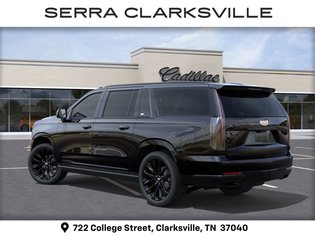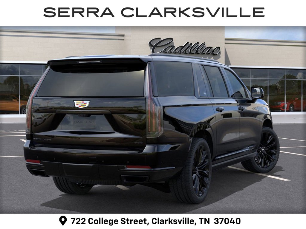 Raven Black 2026 Cadillac Escalade ESV Platinum Edition For sale at Serra Cadillac Clarksville is well equipped with: Touring Package (Air Ride Adaptive Suspension, Power Open/Close Doors, and Soft Closing Front and Rear Doors), 4WD, 2-Presets Memory For Driver Seat Adjuster, 2-Speed Active Transfer Case, 3rd row seats: split-bench, 4-Way Power Driver Lumbar Seat Adjuster, 4-Way Power Front Passenger Lumbar Seat Adjuster, 4-Wheel Disc Brakes, 8-Way Power Driver Seat Adjuster, 8-Way Power Front Passenger Seat Adjuster, ABS brakes, Active Noise Cancellation, Adaptive suspension, Air Conditioning, AKG Studio Reference 38-Speaker Audio System, Alloy wheels, AM/FM radio: SiriusXM with 360L, Apple CarPlay/Android Auto, Audio memory, Auto High-beam Headlights, Auto tilt-away steering wheel, Auto-dimming door mirrors, Auto-dimming Rear-View mirror, Automatic temperature control, Blind Zone Steering Assist with Trailering, Brake assist, Bumpers: body-color, Compass, Delay-off headlights, Door Lock and Latch Shields, Driver door bin, Driver Seat Power Bolster, Driver vanity mirror, Dual front impact airbags, Dual front side impact airbags, Electronic Limited-Slip Differential, Electronic Stability Control, Emergency communication system: OnStar Services capable, Exterior Parking Camera Rear, Four wheel independent suspension, Front anti-roll bar, Front Bucket Seats, Front Center Armrest w/Storage, Front dual zone A/C, Front Passenger Seat Power Bolster, Front reading lights, Full Semi-Aniline Leather Seats with Mini-Chevron, Fully automatic headlights, Garage door transmitter, Genuine wood console insert, Genuine wood dashboard insert, Genuine wood door panel insert, Glass Breakage Sensor, Headphones, Heads-Up Display, Heated and Ventilated Driver and Front Passenger Seats, Heated door mirrors, Heated Driver and Front Passenger Seats, Heated front seats, Heated rear seats, Heated steering wheel, Hitch Guidance with Hitch View, Illuminated entry, Illuminating Front and Rear Sill Plates, Integrated Trailer Brake Controller, Knee airbag, Lane Departure Warning System, Leather steering wheel, Low tire pressure warning, Magnetic Ride Control Suspension, Memory seat, Navigation System, Night Vision, Night vision lights, Occupant sensing airbag, Outside temperature display, Overhead airbag, Overhead console, Panic alarm, Passenger door bin, Passenger vanity mirror. Ask us about special APR rates, lease offers and incentives available on most new 2026 Escalade ESVs. If you're shopping for a new Luxury SUV near Nashville look no further than Serra Cadillac Clarksville.