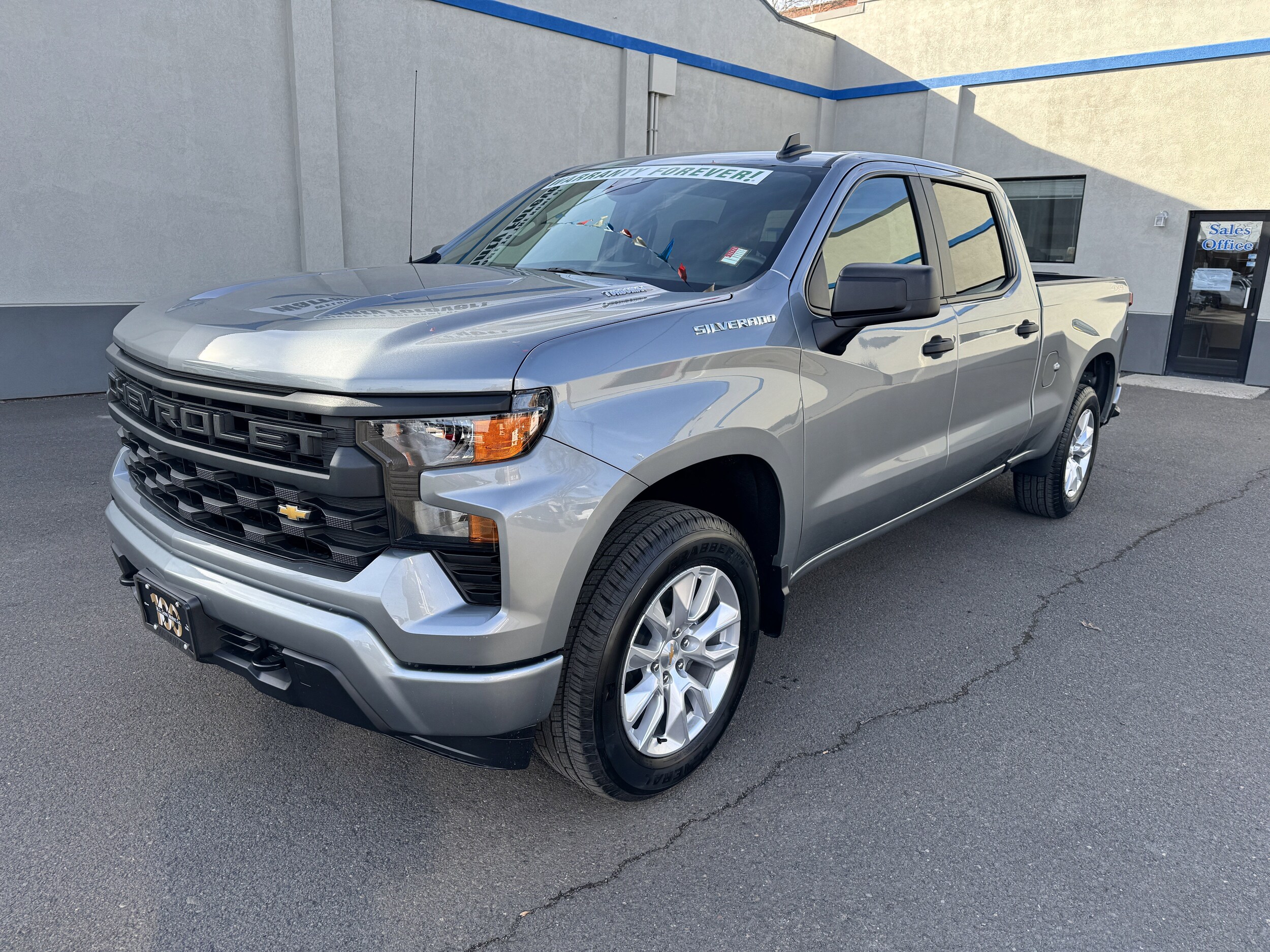 Silverado 1500 Crew Custom 4WD. The TurboMax engine paired with an 8-speed automatic transmission delivers 310 horsepower and 430 lb-ft of torque. This truck features a Sterling Gray Metallic exterior and a Jet Black interior. Enjoy a comfortable ride with seating for up to six, advanced safety features, and the convenience of remote start and a rear window defogger.