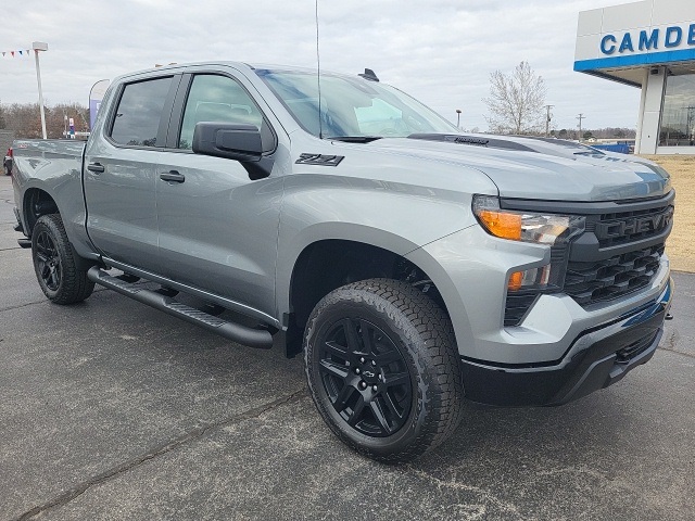 2026 Chevrolet Silverado 1500 Custom, 4D Crew Cab, 2.7L I4 Turbocharged DOHC 16V LEV3-SULEV30 310hp, 8-Speed Automatic, 4WD, 10-Way Power Driver Seat with Lumbar, 120-Volt Bed Mounted Power Outlet, 120-Volt Interior Power Outlet, 220 Amp Alternator, 3.5" Monochromatic Display Driver Info Center, 4-Wheel Disc Brakes, 4" Black Round Assist Steps, 40/20/40 Front Split-Bench Seat, 6-Speaker Audio System, ABS brakes, Air Conditioning, Apple CarPlay/Android Auto, Auto High-beam Headlights, Auto-Locking Rear Differential, Automatic Emergency Braking, Black Chrome Exhaust Tip, Black Name Plates, Bluetooth for Phone, Chevytec Spray-On Black Bedliner, Color-Keyed Carpeting Floor Covering, Custom Convenience Package, Dark Essentials Package, Deep-Tinted Glass, Dual front impact airbags, Dual front side impact airbags, Dual Rear USB Ports (Charge Only), Electric Rear-Window Defogger, Electronic Cruise Control, Electronic Stability Control, Emergency communication system: OnStar, EZ Lift Power Lock & Release Tailgate, Following Distance Indicator, Forward Collision Alert, Front Center Armrest with Storage, Front Pedestrian Braking, Front Rubberized Vinyl Floor Mats, Fully automatic headlights, HD Rear Vision Camera, Heated door mirrors, Heavy-Duty Air Filter, Hill Descent Control, Hitch Guidance, Integrated Trailer Brake Controller, IntelliBeam Automatic High Beam On/Off, LED Cargo Area Lighting, Manual Tilt Wheel Steering Column, OnStar Services Capable, Outside temperature display, Overhead airbag, Performance Red Recovery Hooks, Power door mirrors, Power driver seat, Power Front Windows with Driver Express Up/Down, Power Front Windows with Passenger Express Down, Power Rear Windows with Express Down, Power windows, Preferred Equipment Group 2CX, Radio: Chevrolet Infotainment 3 System.