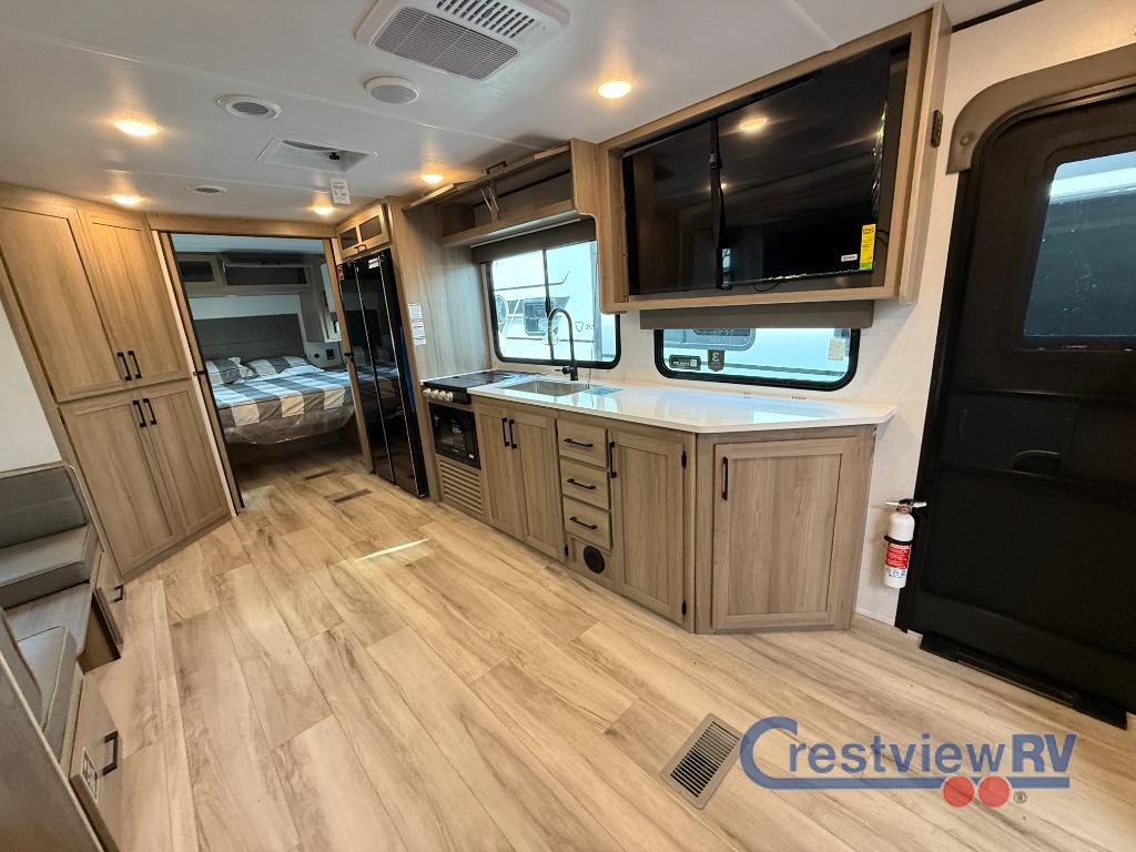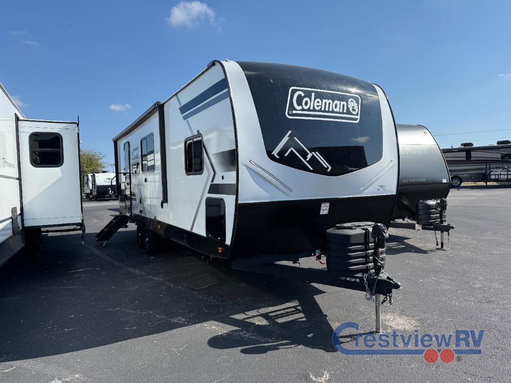 Keystone Coleman Legacy travel trailer 2600RB highlights: Full Rear Bath. 50" TV. 18' Power Awning. Kitchen Pantry. You'll love the amount of interior space you have in this travel trailer thanks to the large slide out! Here, you'll find the theater seating across from the 50" TV, plus the booth dinette where you can dine together. The chef of your group will appreciate the air fryer/convection microwave to make easy meals, and there is a spacious 16 cu. ft. 12V refrigerator for your cold items. The outdoor sink and 2.6 cu.ft. refrigerator also provides a mini half kitchen where you can clean up and grab a cold drink when outdoors! A full rear bath includes a 30" x 40" shower, a linen closet and medicine cabinet, plus a wardrobe to keep clean clothes wrinkle-free. When you're ready for some shut-eye, the king bed in the front private bedroom is sure to bring a great night's rest! With any Coleman Legacy travel trailer by Keystone, you will find added features to make each camping experience one to remember! There is a painted fiberglass front cap with an LED light, a walkable roof, tinted safety glass windows, plus a power tongue jack and electric stabilizer jacks for easy set up. Head inside to enjoy a 6' 10" ceiling height, blackout roller shades, a stainless steel kitchen sink, and an Oxygenics Fury showerhead for added comfort. Each model also features Keystone Exclusives, such as color-coded unified wiring, Tuf-Loc thermoplastic duct joiners, and an I-beam frame with stamped steel cross-members and outriggers for added strength.