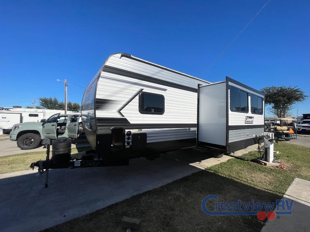 Keystone Coleman Lantern travel trailer 28BHS highlights: Double-Size Bunks, 50" TV and Fireplace, 21' Power Awning, King Bed. If you're needing additional sleeping space and added comfort in your next RV, this travel trailer is the one! There are double-size bunks with steps in the back for your guests or little ones, and the full bath includes one of the dual entry doors to the unit for added convenience. The combined kitchen and living area is made spacious thanks to the large slide out which houses the sofa and booth dinette. You can make meals on the three burner range or in the air fryer/convection microwave, and there is a 16 cu. ft. 12V refrigerator to keep food fresh. A 50" TV and fireplace features hidden shelves behind it for smart storage space plus there is an entryway pantry for snacks galore! Outside, the 21' power awning will provide shade as you visit in your camp chairs, and there is a 2.6 cu. ft. outdoor refrigerator to keep cold drinks on hand! The Coleman Lantern travel trailers by Keystone include innovative features for the outdoor enthusiasts! They are built with a smooth front metal, a walkable roof, and a one-piece heated and enclosed underbelly that will help extend your camping season. Additional exterior features include a shower with hot and cold water, quick drop stabilizer jacks and a power tongue jack, plus a full pass-through storage with extra tall doors. The interior is just as impressive with its blackout night shades, solid surface kitchen countertops, bedside outlets, and extra large 30" x 40" shower to name a few comforts. Each travel trailer also includes a Suburban tankless water heater for endless hot showers, plus Keystones Exclusives such as in-floor heating ducts, Tru-fit slide construction, and more!