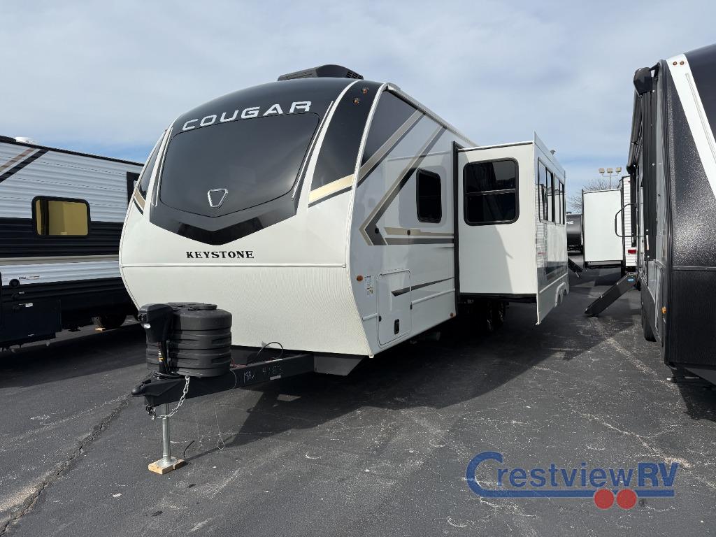 Keystone Cougar Half-Ton travel trailer 26LBW highlights: Large Slide Out, King Bed, 2" Accessory Hitch, Kitchen Pantry. Wherever you decide to camp in this travel trailer, you'll be met with comfort and convenience! The full rear bath includes a space saving sliding door, toilet, sink, and linen closet for towels. A large slide out provides more space to move about, and here you'll enjoy the tri-fold sleeper sofa and booth dinette with storage drawers. There is also a fireplace and TV across from the furniture to enjoy movie nights! The chef of your group can make meals on the cooktop or in the microwave, and there is a pull-out countertop for extra counter space. Up front, a private bedroom includes a king bed, dual nightstands, and washer and dryer prep. The Keystone Cougar Half-Ton fifth wheel and travel trailers are known as one of America's favorites for a reason! Some of those reasons are the exclusive features that come from Keystone, like the Winegard Air 360 Plus omni-directional rooftop antenna, the in-floor heating ducts, and the HyperCore composite wall construction with Vixen Fibrogloss high-gloss finish. The Cougar Half-Ton has a Climate Guard protection package with heat-deflecting white sidewalls, two roof attic vents, PEX plumbing and more to enjoy four season camping. Inside, you'll love the dimmable lighting, night roller shades throughout, shower skylight, and bedside USB outlets to keep your electronics charged.