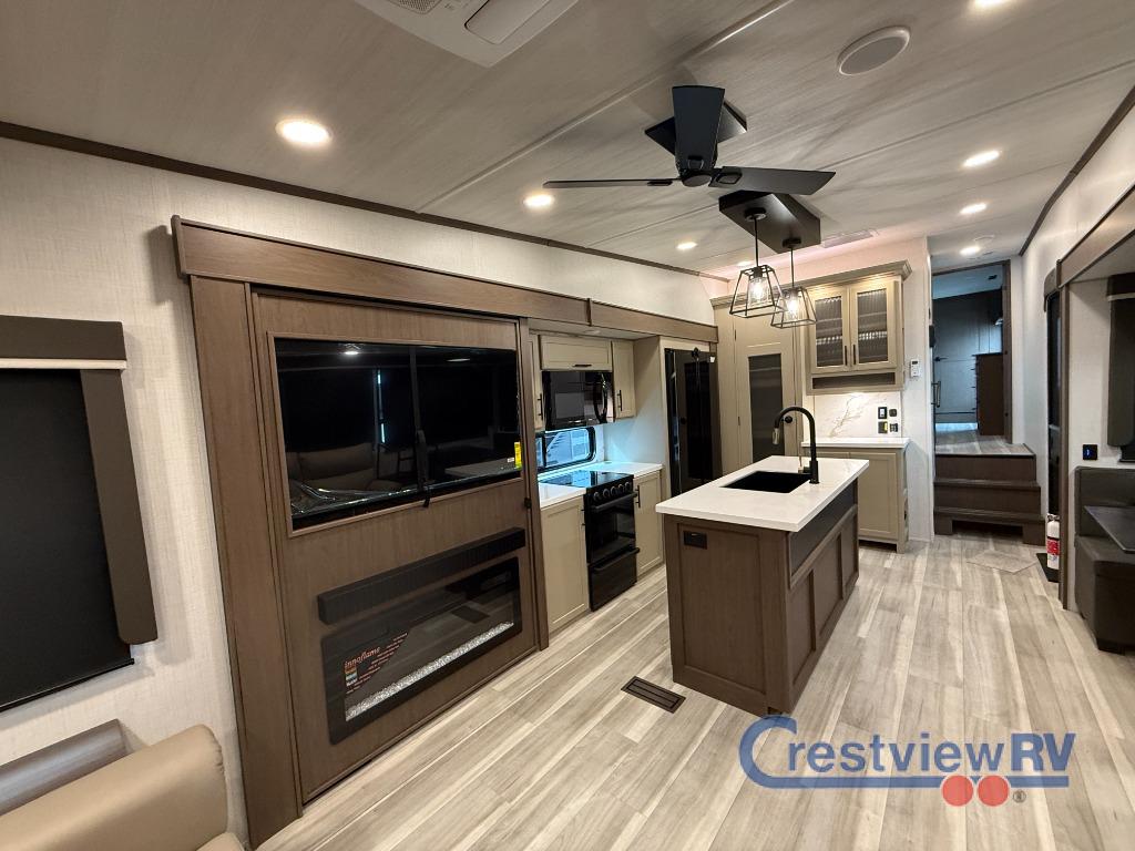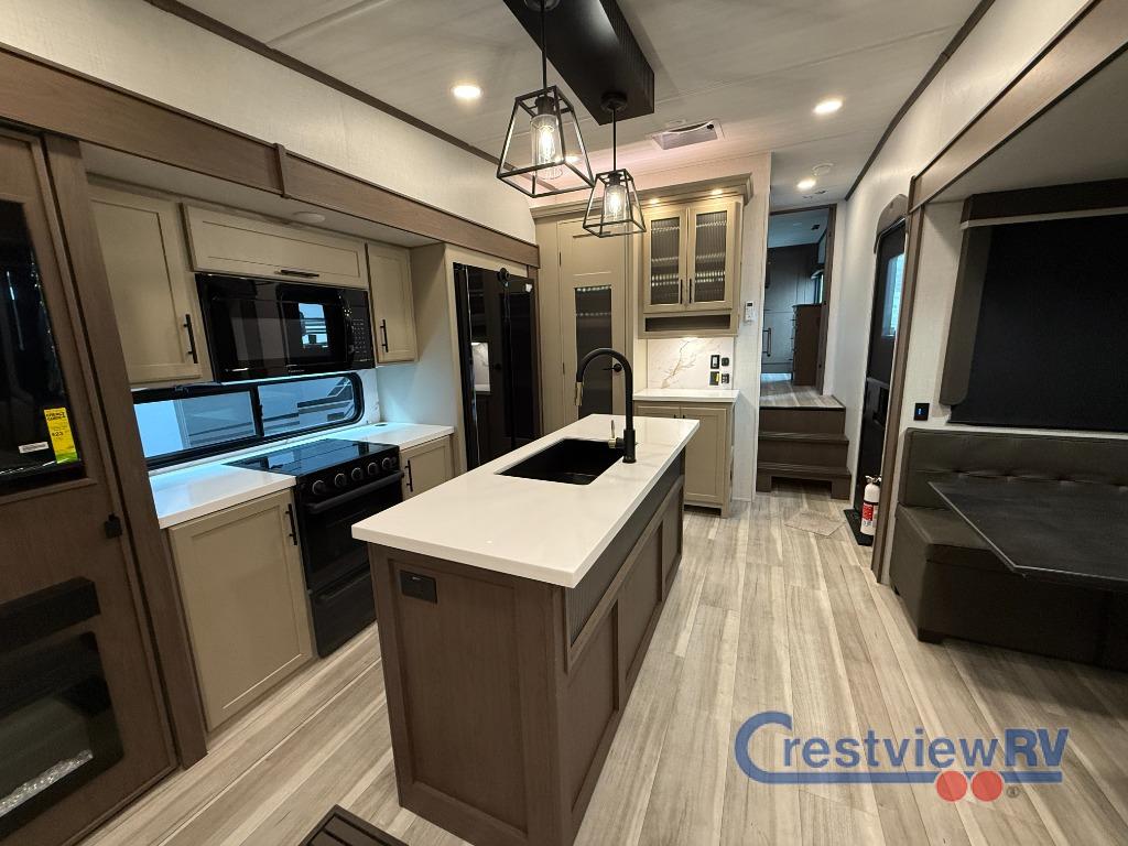 Keystone Cougar fifth wheel 316RLS highlights: Shower with a Seat, Kitchen Island, Queen Bed Slide, Tri-Fold Sleeper Sofa, Two Awnings, 12V Ceiling Fan. The dual opposing slides in the combined kitchen and living area will give you an open floorplan! You'll sleep on the queen-size bed in the front private bedroom, and there is under-bed storage, a full-height wardrobe, and a dresser with hidden storage for all of your personal belongings. As you spend time in the main living area, you'll appreciate having extra space thanks to the set of opposing slides, and the kitchen island will be easy to work on. You'll be able to relax on the apple car and watch the LED HDTV with an entertainment door and watch the LED HDTV. There is also a booth in the main living area that you can see. The dual zone Bluetooth audio system is available. The full-body paint matte finish is available. Each model is available with this description. All features are subject to change.