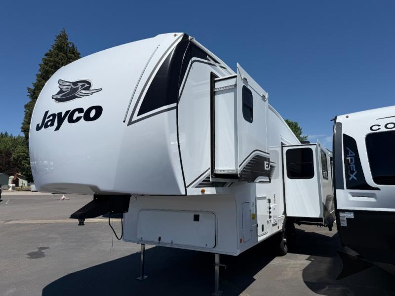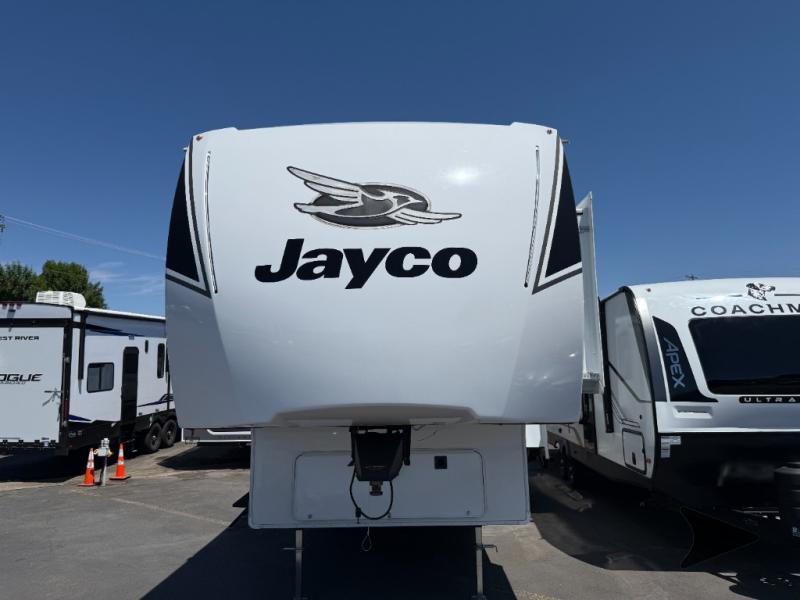 Jayco Eagle SLE fifth wheel 24MLE highlights: Tri-Fold Sofa Slide, Queen Bed, 30" x 36" Shower, Rear Kitchen. Camping just got a whole lot sweeter in this fifth wheel with double slides, a rear kitchen, and sleeping space for five to six. You'll love waking up each morning in the front private bedroom that includes a queen bed, dual nightstands and overhead cabinets, plus a wardrobe and dresser slide. Your guests who slept on the tri-fold sofa and booth dinette can convert these back to seating space in the morning, and breakfast can be made in the rear kitchen. Outside, you're sure to enjoy the 16' power awning with LED Lights! With any Eagle SLE fifth wheel by Jayco, you will enjoy a lighter tow weight, high-end finishes, and the same quality construction you've come to expect from Jayco!