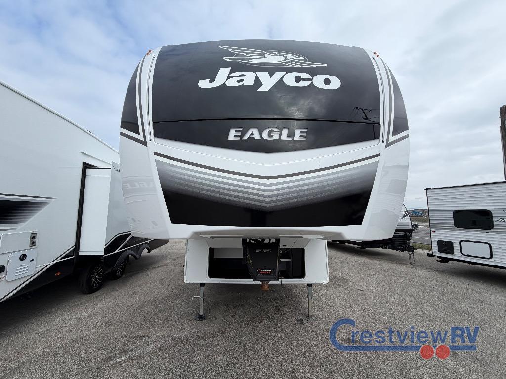Jayco Eagle HT fifth wheel 29DDB highlights: Exterior Jayport. Theater Seat. Outside Kitchen. Olympic Queen Bed. Bunk Storage. If you're needing a fifth wheel with more sleeping space, this unit will be perfect for you! There are double-size bunks in the back with a wardrobe for your guests' things and TV prep if you want to add a TV here. The front private bedroom up front will have you feeling right at home with its Olympic queen bed and dual wardrobes, and any additional guests you have can sleep on the U-shaped dinette within the slide out. There is also a theater seat here where you can relax with a good book in the evenings. With any Eagle HT fifth wheel or travel trailer by Jayco you will enjoy a smooth drive thanks to the 4 Star Handling Package and MORryde CRE-3000 rubberized suspension. The Customer Value Package includes amenities that are sure to make camping easier than ever, like the 60K on-demand water heater, Keyed-Alike lock system, 15,000 BTU "Whisper Quiet" A/C, and more. Handcrafted door/drawer fronts will make your space feel more like home, along with residential vinyl flooring throughout, GE appliances, and blackout roller shades with reflective side throughout to keep the sun out when you want to sleep in. Each model also includes a NuVo H2O water treatment system with filters included, interior and exterior "Blue Sync" audio connect with MB Quart Sound for your TV and phone, and 100% no floor vents for added comfort and convenience!