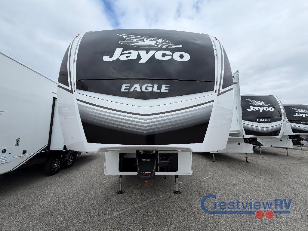 Jayco Eagle fifth wheel 335LSTS highlights: Spacious Front Private Bedroom. Two Power Awnings. U-Shaped Kitchen. Roll-Top Dinette. Kitchen Pantry. It will be so easy to enjoy time in this spacious fifth wheel! The rear living area includes an entertainment center with a fireplace across from the L-shaped sofa for movie nights. There is also a theater sofa with cup holders plus a roll-top dinette with two chairs to dine at. The chef of your group will love the generous counter space in the middle kitchen, and there is a large pantry to keep food stocked. Heading up front, you'll find the spacious bathroom that includes a shower with a seat, and the front private bedroom with a king bed slide out. There is also a chest with a TV, front shelves with drawers, plus washer and dryer prep! With any Eagle fifth wheel by Jayco you will appreciate durable construction materials, like the Magnum Truss Roof and the Stronghold VBL laminated walls. The JayCommand Smart RV system puts you in control of your RV's functions, and the 5 Star Handling Package will provide smooth towing from home to camp. Each model features Climate Shield zero-degree tested weather protection and the industry-exclusive Helix cooling system that features two 15,000 BTU Whisper Quiet A/C's to keep you comfortable year around. Some of the exterior conveniences you are sure to love are the pass-through storage with Slam-Latch baggage doors and an automotive style front cap with max turn radius. The Eagle fifth wheels are designed to make you feel at home with solid hardwood slide fascia, residential vinyl flooring throughout, 100% no floor vents, and blackout roller shades with reflective side throughout for added privacy and insulation.
