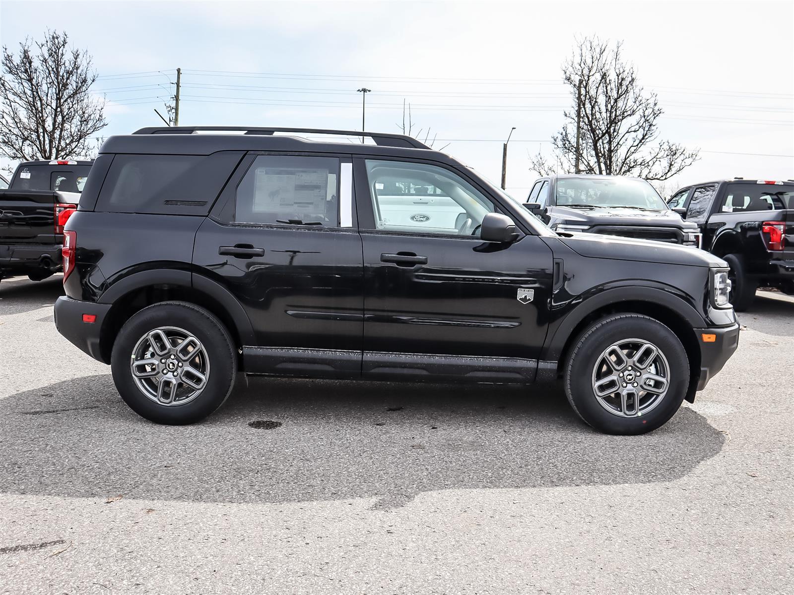 Discover the 2026 Ford Bronco Sport Big Bend in Shadow Black – a rugged yet refined 4x4 SUV designed for Canadian adventurers craving versatility and confidence on every terrain. Built to tackle city streets and backcountry trails alike, this Bronco Sport features a turbocharged 1.5L EcoBoost engine paired with an 8-speed automatic transmission and advanced Terrain Management System offering five G.O.A.T. (Goes Over Any Terrain) modes, including off-road, slippery, and sport settings. Whether navigating snowy roads or exploring forest paths, the 4x4 drivetrain ensures optimal traction and control. Inside, the Med Light Smoked Truffle interior combines comfort with practicality. Heated front bucket seats with adjustable lumbar support keep you comfortable during chilly mornings, while the power driver seat and pass-through rear bench enhance convenience. The premium wrapped steering wheel and floodlight adjustable liftgate add thoughtful touches for everyday ease. Safety is paramount with features like Blind Spot Monitor, Cross-Traffic Alert, Lane Keeping Assist, and Front Collision Mitigation, giving you peace of mind on busy highways or remote routes. Custom front and rear floor liners protect the interior from mud and snow, making this Bronco Sport ready for all your Canadian adventures.