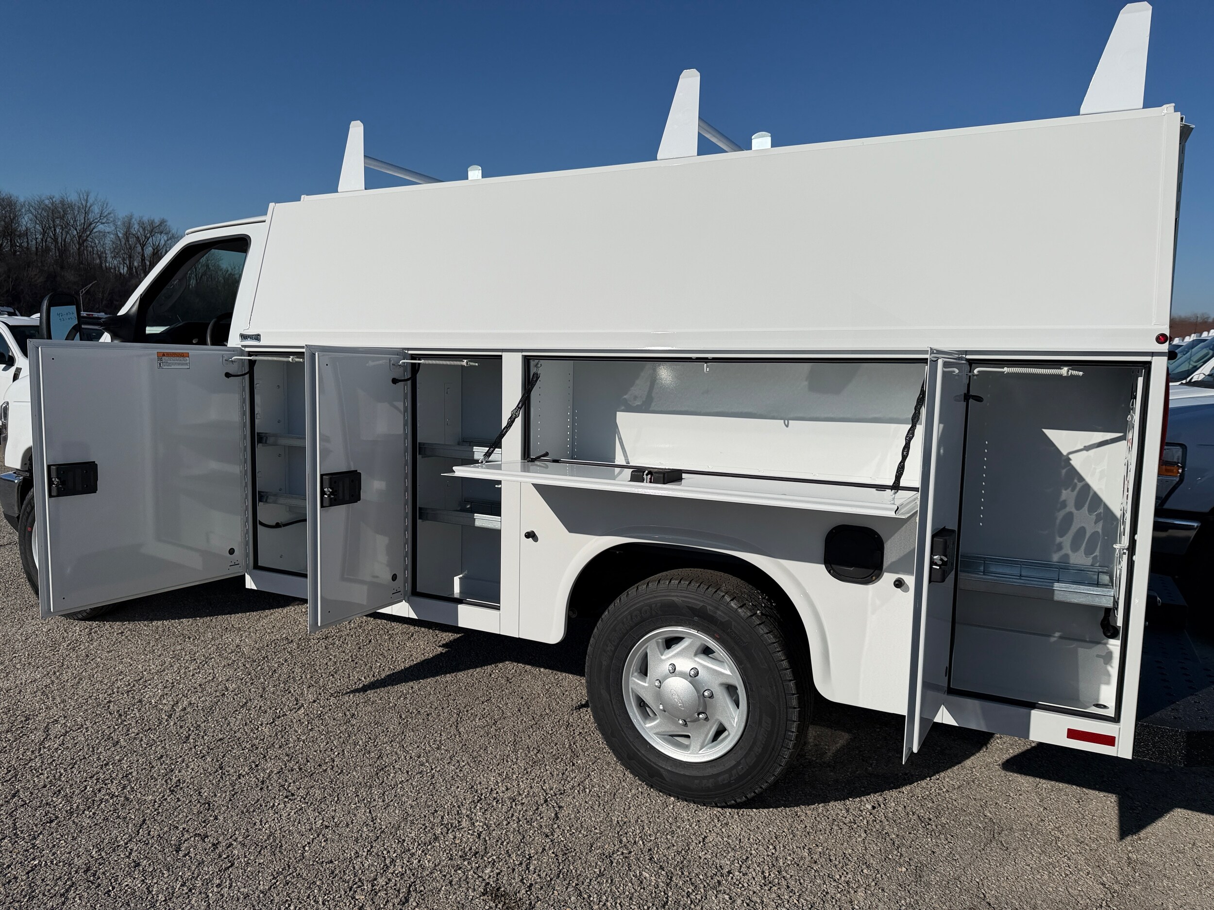 Knapheide Ultra Low Roof KUV with 3 bar ladder rack, power lock package for bins and rear doors, rear camera system with mirror mounted monitor, trailer tow package, Knaplined rear step bumper, strobe lights. Sale price includes KUV body and installation, Ford window sticker reflects chassis pricing only and does not include the additional cost of this upfit. See dealer for details.