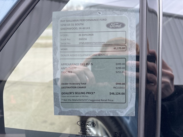 2026 Ford Explorer Active Blue 4WD 10-Speed Automatic 2.3L EcoBoost I-4 20/27 City/Highway MPG 4WD. Since first opening our doors, Ray Skillman Ford has been proud to serve Indianapolis, Greenwood and Franklin drivers. Our firm commitment to top-notch customer service has situated us as a leading area Ford dealer, and this is what keeps our customers coming back time and again. We offer a wide selection of vehicles and are excited to help you find a car that's tailored to your specific needs. Call or text 317-885-9800 to schedule your test drive today! All offers shown do not include tax, title, $251 doc/compliance fee, and $299 theft charge. Price includes the following rebates. Not all customers qualify for all rebates:$3500 - Retail Customer Cash. Exp. 03/31/2026.