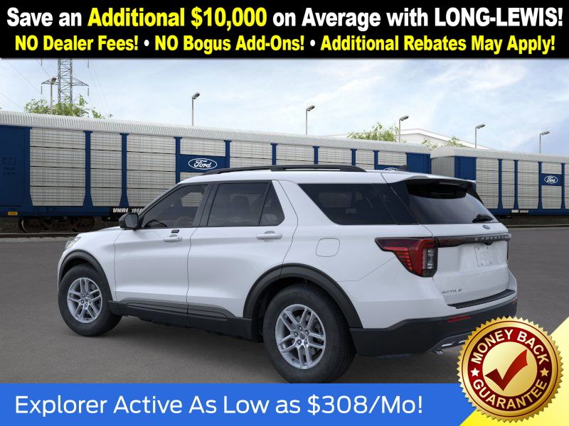 Space White Metallic 2026 Ford Explorer Active NFT RWD 10-Speed Automatic 2.3L EcoBoost I-4 3rd row seats: bench, 4-Wheel Disc Brakes, 6 Speakers, ABS brakes, Air Conditioning, Alloy wheels, AM/FM radio: SiriusXM with 360L, AM/FM Stereo, Apple CarPlay/Android Auto, Auto High-beam Headlights, Automatic temperature control, Brake assist, Bumpers: body-color, Compass, Delay-off headlights, Driver door bin, Driver vanity mirror, Dual front impact airbags, Dual front side impact airbags, Electronic Stability Control, Emergency communication system: 911 Assist, Exterior Parking Camera Rear, Four wheel independent suspension, Front anti-roll bar, Front Bucket Seats, Front Center Armrest, Front dual zone A/C, Front License Plate Bracket, Front reading lights, Fully automatic headlights, Heated door mirrors, Illuminated entry, Knee airbag, Low tire pressure warning, Navigation System, Occupant sensing airbag, Outside temperature display, Overhead airbag, Overhead console, Panic alarm, Passenger door bin, Passenger vanity mirror, Power driver seat, Power steering, Power windows, Rear air conditioning, Rear anti-roll bar, Rear reading lights, Rear window defroster, Rear window wiper, Remote keyless entry, Security system, Speed control, Speed-sensing steering, Speed-Sensitive Wipers, Split folding rear seat, Spoiler, Steering wheel mounted audio controls, Tachometer, Telescoping steering wheel, Tilt steering wheel, Traction control, Trip computer, Variably intermittent wipers, Wheels: 18" Sparkle Silver-Painted Aluminum. Recent Arrival! 20/29 City/Highway MPG. Long-Lewis Ford of the Shoals is dedicated to your satisfaction before, during, and after your purchase. We'll go the extra mile to take care of you.