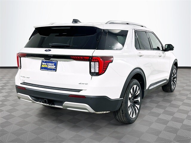 Recent Arrival! White Metallic 2026 Ford Explorer Platinum 4WD 2.3L EcoBoost I-4 4D Sport Utility 10-Speed Automatic 4WD, 14 Speakers, 3rd row seats: bench, 4-Wheel Disc Brakes, ABS brakes, ActiveX Trimmed Captain's Chairs, Air Conditioning, Alloy wheels, AM/FM radio: SiriusXM with 360L, Apple CarPlay/Android Auto, Auto High-beam Headlights, Auto-dimming door mirrors, Auto-dimming Rear-View mirror, Automatic temperature control, Brake assist, Bumpers: body-color, Compass, Delay-off headlights, Driver door bin, Driver vanity mirror, Dual front impact airbags, Dual front side impact airbags, Electronic Stability Control, Emergency communication system: 911 Assist, Equipment Group 600A Standard Package, Exterior Parking Camera Rear, Ford Connectivity Package (one-Time Purchase - 7 Years), Four wheel independent suspension, Front and 2nd Rows Floor Liners with Carper Floor Mats, Front anti-roll bar, Front Bucket Seats, Front Center Armrest, Front dual zone A/C, Front fog lights, Front reading lights, Fully automatic headlights, Garage door transmitter, Heated door mirrors, Heated front seats, Heated rear seats, Heated steering wheel, Illuminated entry, Internet access capable: FordPass Connect 5G, Knee airbag, Leather steering wheel, Low tire pressure warning, Lux Leather Package, Memory seat, Navigation System, Occupant sensing airbag, Outside temperature display, Overhead airbag, Overhead console, Panic alarm, Panoramic Fixed Glass Roof with Power Shade, Passenger door bin, Passenger vanity mirror, Platinum Badges on Front Row Seats, Power door mirrors, Power driver seat, Power Liftgate, Power passenger seat, Power steering, Power windows, Premium Leather Seating Surfaces Captain's Chairs, Quilting and Stitching on Door Panels, Quilting and Stitching on Seats, Radio data system, Radio: B&O Sound System by Bang & Olufsen with HD, Rain sensing wipers, Rear air conditioning, Rear anti-roll bar, Rear reading lights, Rear window defroster, Rear window wiper, Remote keyless entry, SecuriCode Keyless Entry Keypad, Security system, SiriusXM with 360L (3-Year Plan), Speed control, Speed-sensing steering, Speed-Sensitive Wipers, Split folding rear seat, Spoiler, Steering wheel mounted audio controls, Tachometer, Telescoping steering wheel, Tilt steering wheel, Traction control, Trip computer, Turn signal indicator mirrors, Variably intermittent wipers, Ventilated front seats.