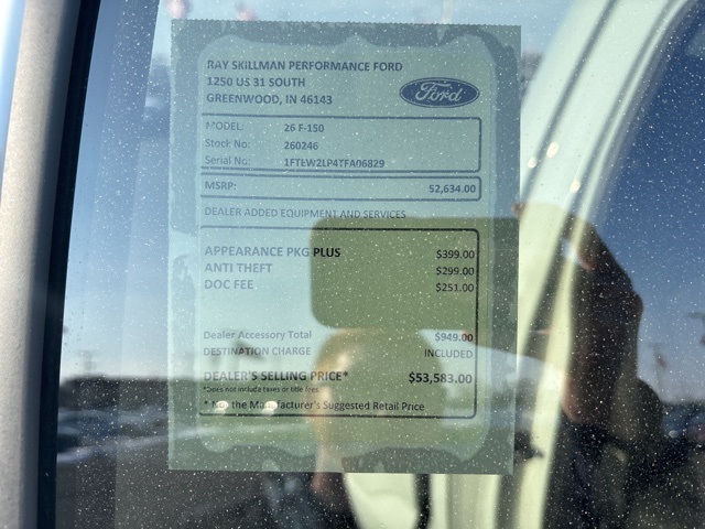 2026 Ford F-150 STX Avalanche 4WD 10-Speed Automatic 2.7L V6 EcoBoost 4WD. Since first opening our doors, Ray Skillman Ford has been proud to serve Indianapolis, Greenwood and Franklin drivers. Our firm commitment to top-notch customer service has situated us as a leading area Ford dealer, and this is what keeps our customers coming back time and again. We offer a wide selection of vehicles and are excited to help you find a car that's tailored to your specific needs. Call or text 317-885-9800 to schedule your test drive today! All offers shown do not include tax, title, $251 doc/compliance fee, and $299 theft charge. Price includes the following rebates. Not all customers qualify for all rebates:$2000 - Retail Customer Cash. Exp. 03/31/2026.