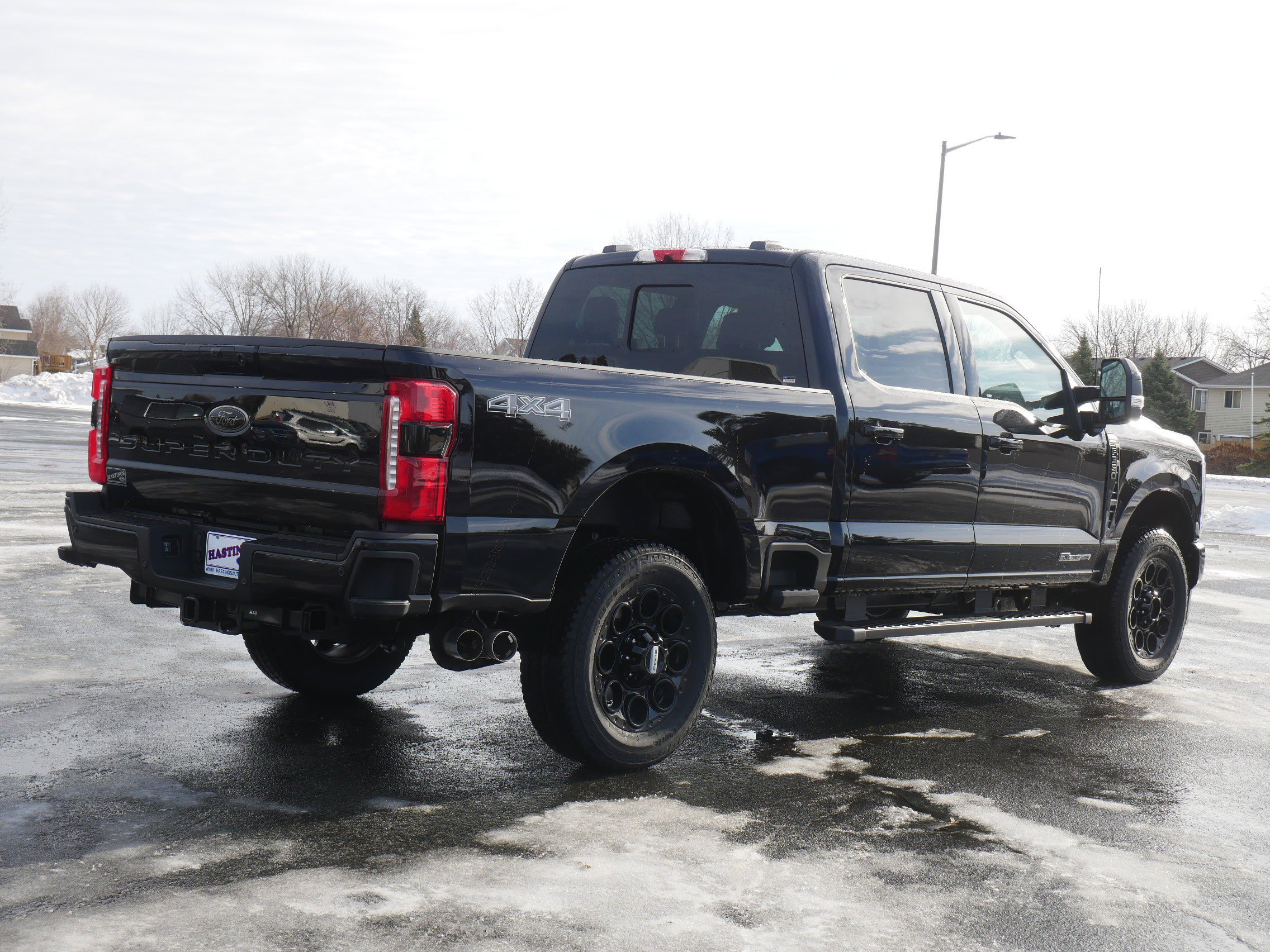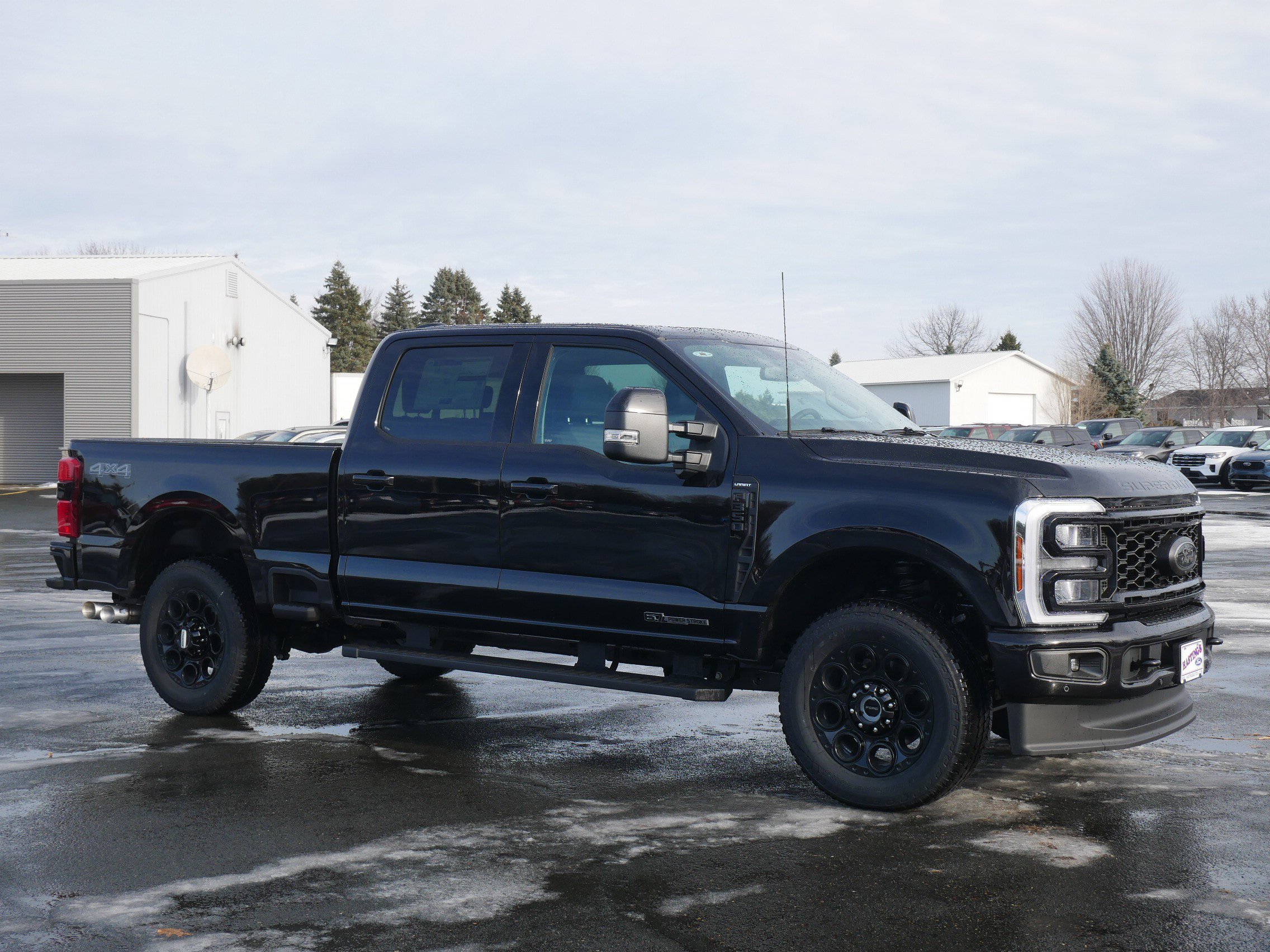 The 2026 Ford Super Duty F-350 Lariat features a powerful 6.7L V8 Turbo Diesel engine, a premium black appearance package, and a range of advanced technology and safety features. This crew cab truck is designed for both heavy-duty work and comfort, offering features like heated and ventilated seating, a premium sound system, and a suite of driver assistance systems. The Agate Black Metallic exterior is complemented by a black interior, and the truck is equipped with four wheel drive and a range of towing capabilities.