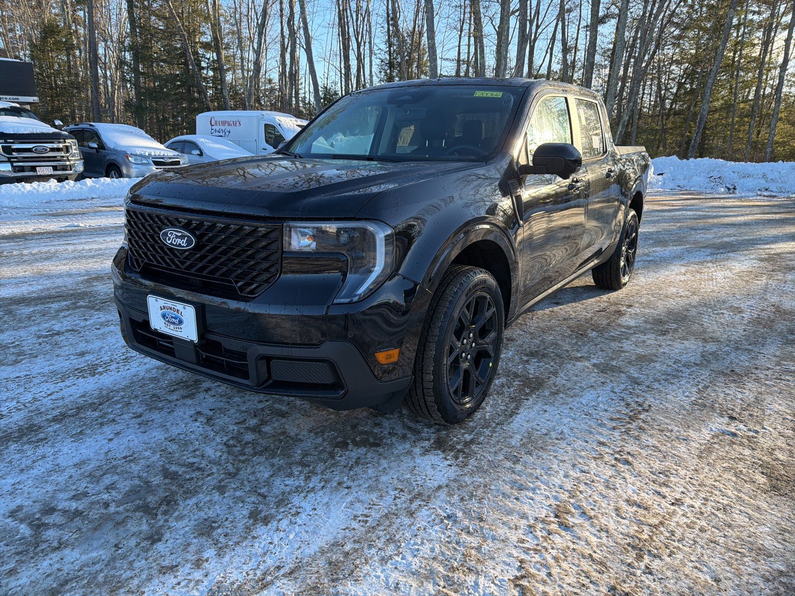 The 2026 Ford Maverick Lariat® is a new small pickup with a 2.0L EcoBoost engine and all-wheel drive. It features a Shadow Black exterior and Black Onyx interior. The vehicle is equipped with advanced technology and safety features, and is available on the Arundel Ford lot.