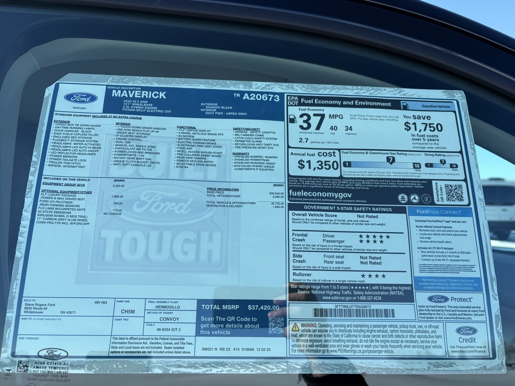 Shadow Black 2026 Ford Maverick XLT AWD CVT 2.5L I-4 Hybrid. At Steve Rogers Ford in Whitehouse, OH, we pride ourselves on offering an extensive selection of new and pre-owned Ford vehicles, including popular models like the Ford F-150, Super Duty, Escape, and Explorer. Our dealership is committed to delivering exceptional customer service and providing a seamless car buying experience. With our competitive pricing, special offers, and financing options, you can drive away in your dream Ford today. Visit us to discover why Steve Rogers Ford is the go-to destination for drivers in Ohio. Our knowledgeable sales team and top-notch service department are here to assist you with all your automotive needs. We're big enough to compete, small enough to care.