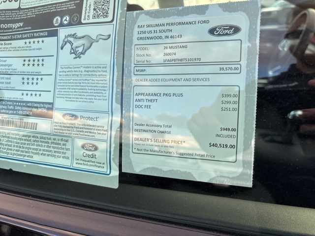 2026 Ford Mustang EcoBoost Shadow Black RWD 10-Speed Automatic EcoBoost 2.3L I4 GTDi DOHC Turbocharged VCT 21/32 City/Highway MPG. Since first opening our doors, Ray Skillman Ford has been proud to serve Indianapolis, Greenwood and Franklin drivers. Our firm commitment to top-notch customer service has situated us as a leading area Ford dealer, and this is what keeps our customers coming back time and again. We offer a wide selection of vehicles and are excited to help you find a car that's tailored to your specific needs. Call or text 317-885-9800 to schedule your test drive today! All offers shown do not include tax, title, $251 doc/compliance fee, and $299 theft charge. Price includes the following rebates. Not all customers qualify for all rebates:$500 - Retail Customer Cash. Exp. 03/31/2026.