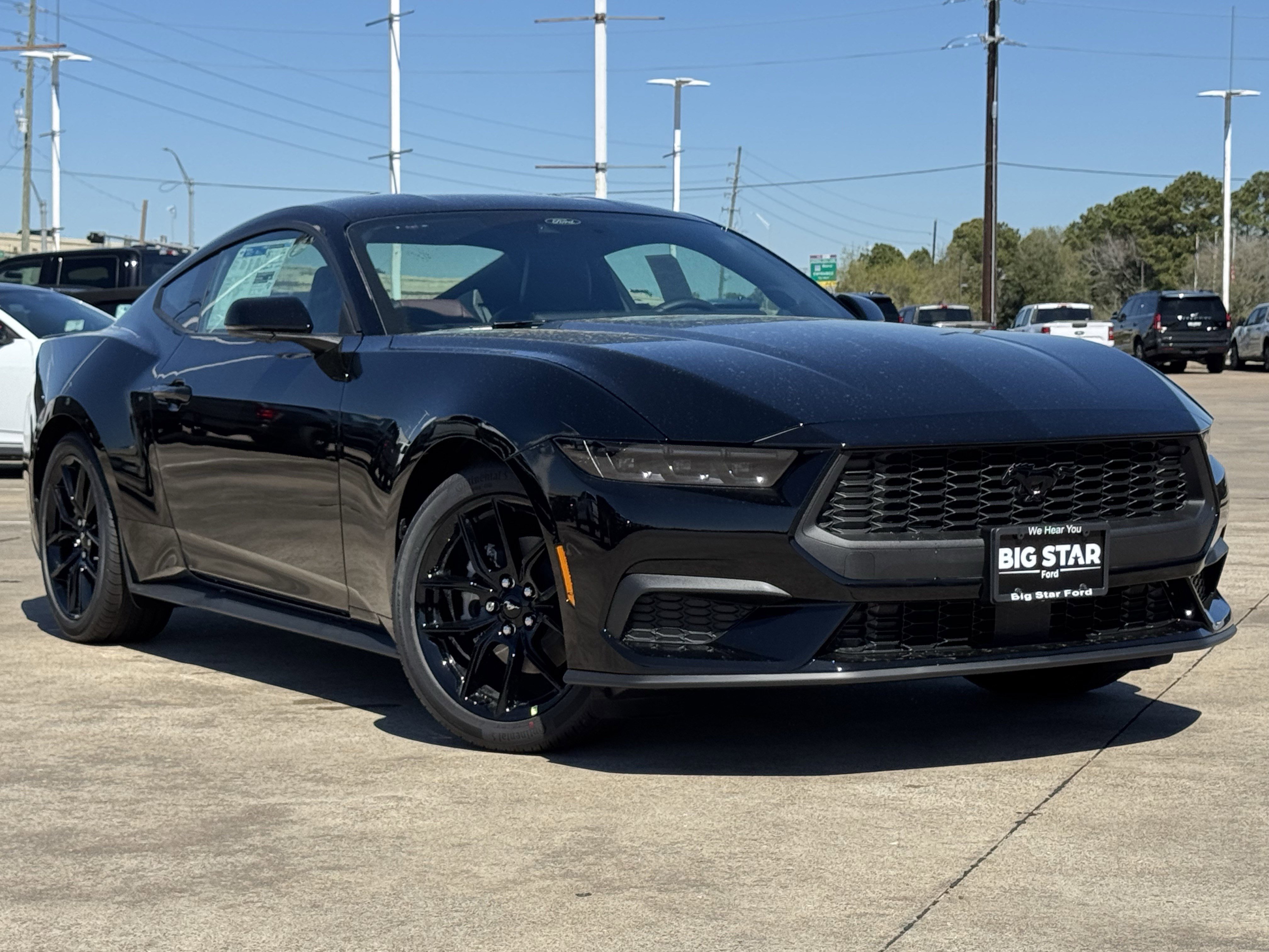 BIG STAR FORD is located at 17717 South FWY, Manvel, TX 77578. Call our Internet team at 346-536-8768 to set a VIP appointment and come for an exceptional car buying experience. This 2026 Ford Mustang EcoBoost Premium is a true standout in its class. With its sleek, sporty design and impressive performance capabilities, this vehicle is the perfect blend of style and power. Featuring an EcoBoost 2.3L I4 GTDi DOHC Turbocharged VCT engine and a 10-Speed Automatic transmission, this Mustang delivers an exhilarating driving experience with an exceptional 22 city / 33 highway MPG. The exterior of this Mustang is finished in a sleek and sophisticated Black, creating a bold and commanding presence on the road. Inside, the cabin is outfitted with premium features and materials, ensuring a comfortable and refined driving experience. From the leather-trimmed bucket seats to the advanced SYNC 4 infotainment system, every detail has been carefully crafted to provide the ultimate in style and functionality. The Ford Co-Pilot360 Assist+ suite of advanced safety and driver-assist technologies, including Adaptive Cruise Control and Lane-Keeping System, offer added peace of mind and confidence behind the wheel. And with the Magnesium Framed Panoramic Curved Display, you'll enjoy a truly immersive and intuitive user experience. Whether you're looking for a thrilling daily driver or a head-turning weekend warrior, this 2026 Ford Mustang EcoBoost Premium is the perfect choice. With its exceptional performance, advanced features, and stunning good looks, this Mustang is sure to impress. Schedule your VIP appointment today and experience the power and passion of this remarkable vehicle.