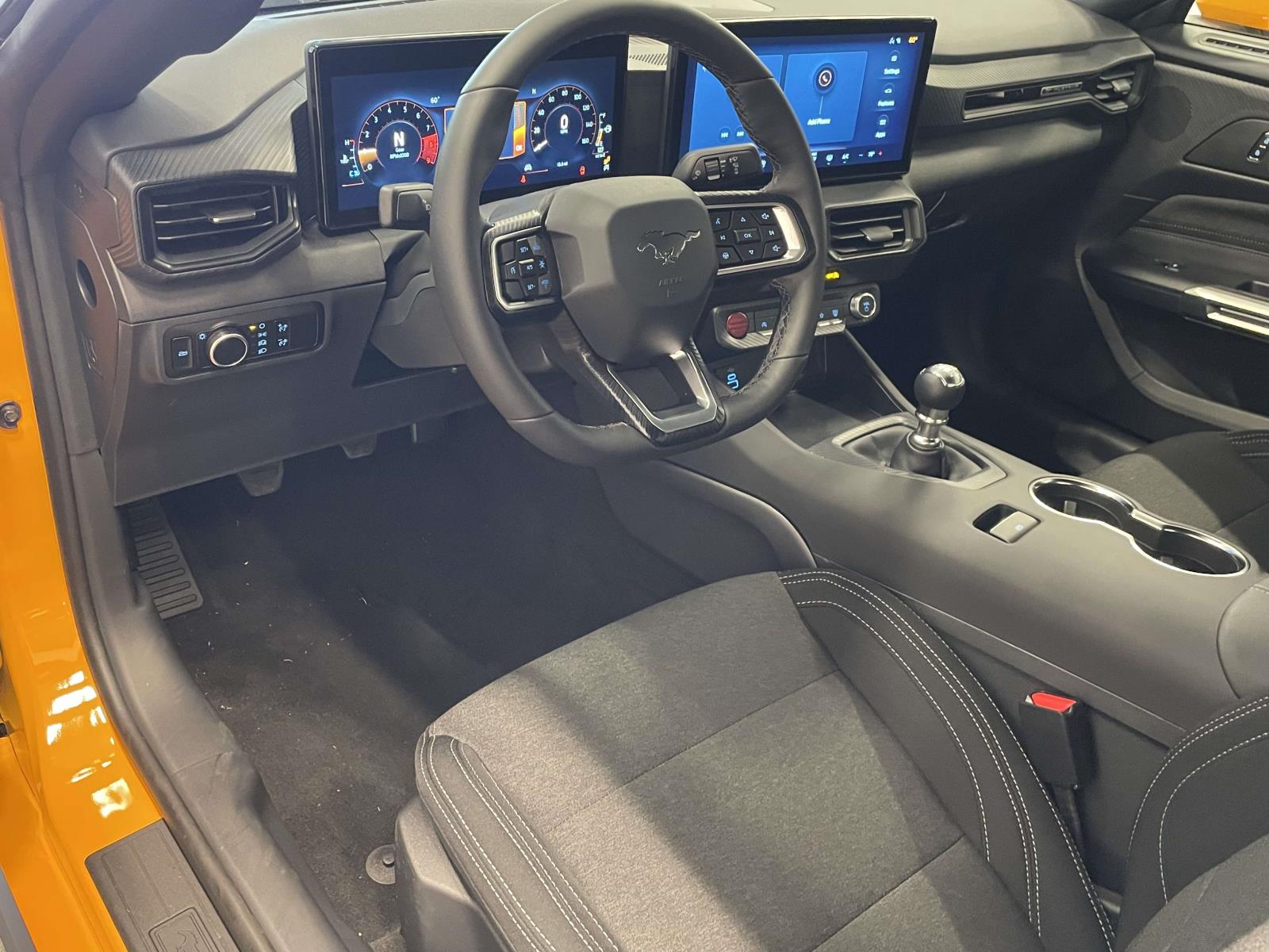 The 2026 Ford Mustang GT is a new coupe with a 5.0L V8 Ti-VCT engine and a 6-speed manual transmission. It features a premium Orange Fury Metallic Tri-Coat exterior and a Black Onyx interior. The vehicle is equipped with a Limited Slip Rear Axle, premium floor liners, and a wedge decklid spoiler. It includes advanced safety features, a SYNC 4 system, and cloth bucket seats. The Mustang GT is designed for both performance and comfort, offering a smooth ride and a range of modern technology and driver assistance systems.
