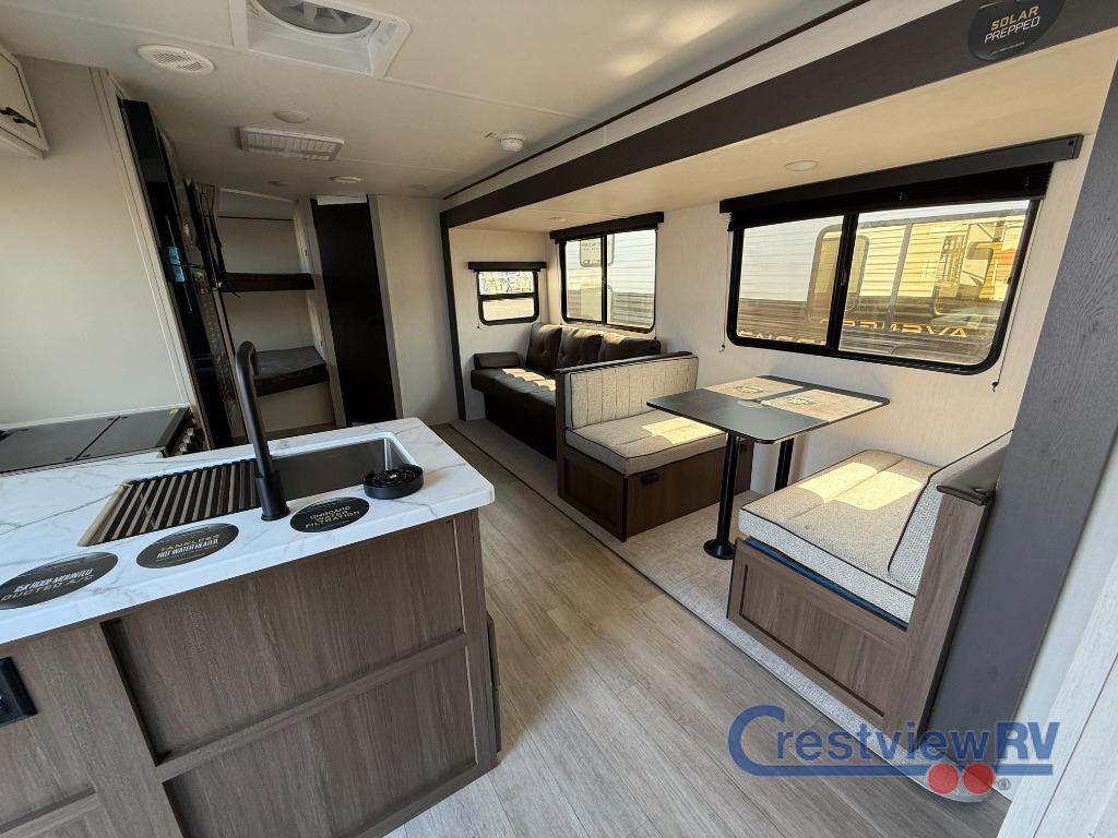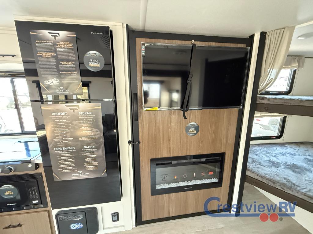 Prime Time Avenger travel trailer 26DBS highlights: Large Slide Out, TV and Fireplace, Oversized Window, Double-Size Bunks. You'll appreciate the added space in this travel trailer thanks to the large slide out! The booth dinette and sofa are found here, and there is a movable storage ottoman for extra blankets or board games. You'll have your own space up front in the private bedroom, complete with a camp king bed and storage for your things, while your guests take the double-size bunk beds towards the back. The chef of your group will find a three burner cooktop and a built-in convection microwave with an air fryer to cook meals, plus there is a 12V refrigerator and large hidden pantry for food storage. This unit also includes a power awning outdoors and an outside refrigerator to keep cold drinks close by. With any Avenger travel trailer by Prime Time RV, you will find innovation, a solid build, and comfort at every turn. Each model is built with Tuff Coat on the exterior metal, a fully enclosed underbelly, and a PVC roof membrane to help extend the life of your trailer. You will also find automotive name badging on the exterior, along with an exterior shower, front rail LED light strips, plus an XL padded entry grab handle to name a few conveniences. There are plenty of storage spaces inside, as well as Congoleum flooring and woven PVC marine grade slide out flooring, a designer shower surround, and seamless pressed countertops. You are sure to appreciate the onboard water filtration system, tankless water heater, plus 30K BTU furnace and 15K ducted A/C to help keep you comfortable.
