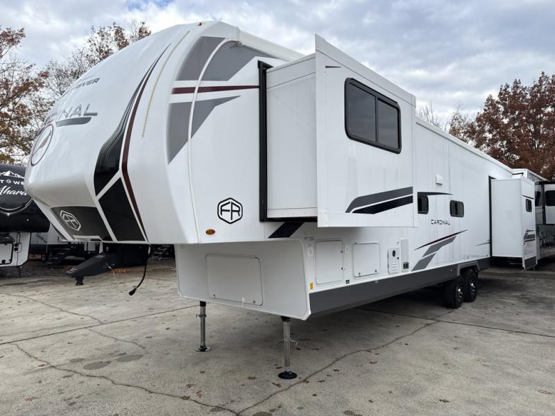 Forest River Cardinal fifth wheel 35FL highlights: Front Entertainment. This fifth wheel is packed with features to make each trip enjoyable! The middle kitchen might be your favorite room with wrap-around counter space, a pantry, and a 16 cu. ft. 12V refrigerator for food storage. You can dine at the hi-top table and chairs here, or sit in the front living area on the dual sofas and theater seating! This area can become your guests bedroom at night since there are dual opposing slides and wardrobe storage for their things. You will also find a full-length wardrobe in the rear private bedroom, along with a king bed slide out, plus washer and dryer prep! And of course there is a full bath so everyone can stay clean each day! With any Cardinal fifth wheel by Forest River you will enjoy affordable luxury at every turn. These models are constructed with residential fiberglass insulation in the roof and floor, a sectioned ABS plastic underbelly armor, and a vacuum bonded, welded aluminum structure for added strength and durability. You will also find seamless roto-cast holding tanks, an outdoor shower, and 4-point auto leveling for quick and easy setup. There are carpet-free living spaces, residential backsplash, motion lighting throughout, and many more comforts!