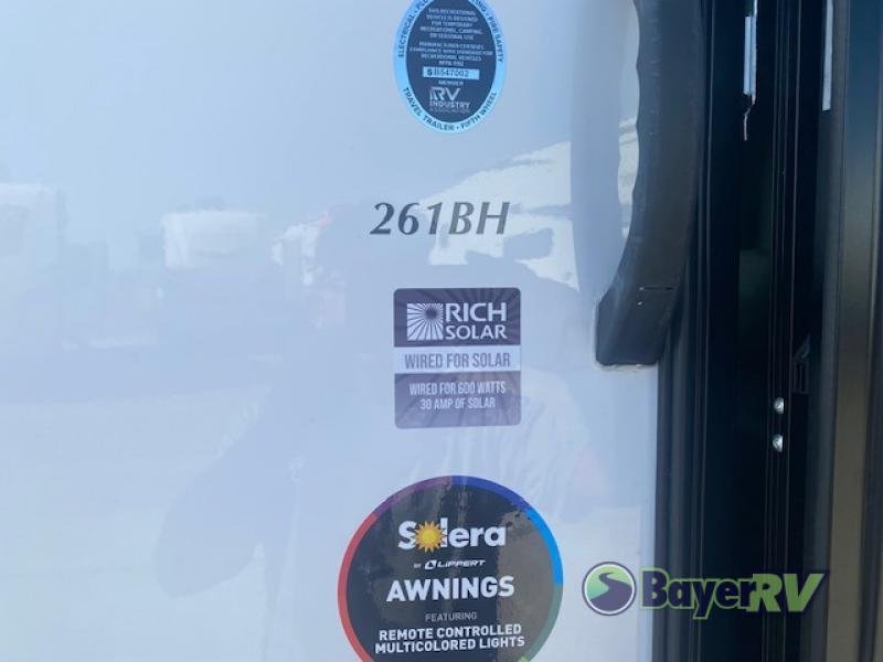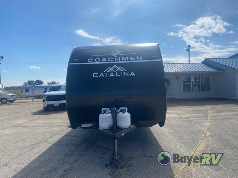 Coachmen RV Catalina Summit Series 8 travel trailer 261BH highlights: Double Size Bunks, Booth Dinette, Queen Bed, Sofa, Pass-Through Storage. You get to choose to sit at the sofa or at the booth dinette when you are relaxing inside. There is a shelf with storage totes above the sofa for your belongings, and an additional overhead cabinet above the dinette for games. Maybe you want to rest on your own queen bed in the front semi-private bedroom before you make a meal in the kitchen or take a hike through the trails around the lake. The 15' electric awning with multi-color LED lights and a remote offers an outdoor living area where you can visit with other RVers. The kids will love their own double-size bunks that they can share with a friend or two, and the full bathroom is nearby as an added convenience. With any Catalina Summit Series 8 by Coachmen you will enjoy an affordable vehicle.