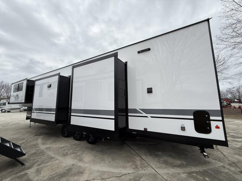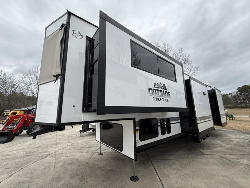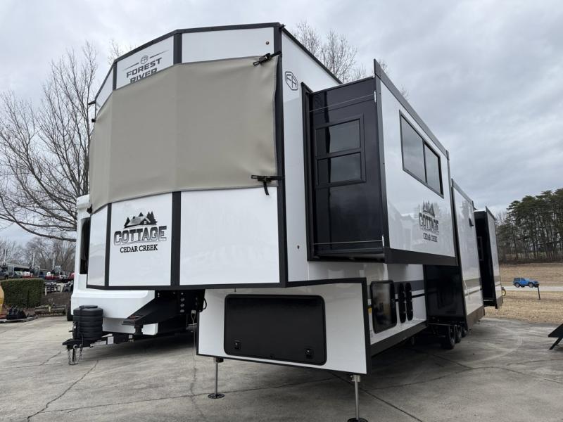 Forest River Cedar Creek Cottage Fifth Wheels destination fifth wheel 413FWC highlights: Front Living Area, Bath and a Half, Rear Bathroom, Two Sinks. Unwind and refresh in this serene space of the rear bathroom, featuring dual sinks and a spacious linen closet for added convenience and storage. Drift off to sleep surrounded by peaceful surroundings in the private bedroom, complete with a plush king bed, an elegant dresser, and a stunning TV mounted above. The kitchen is a culinary haven, equipped with ample overhead cabinets, a convenient microwave, and a spacious fridge. The ample pantry and second pantry offer ample storage for your favorite ingredients and snacks. Plus, you can enjoy meals with loved ones at the table with swivel chairs! Also, the coat closet and half bath add a touch of practicality, making this fifth wheel perfect for everyday living or extended adventures. The front living room is a vibrant gathering space, featuring a comfortable sectional sofa and a cozy fireplace so you can snuggle up and enjoy quality time with family and friends while watching your favorite shows on the TV! Hop on new adventures with these Forest River Cedar Creek Cottage Fifth Wheels! Each destination fifth wheel features a 101" wide body frame that provides a sturdy foundation for your adventures, while the AlphaPly TPO roof membrane offers superior durability and weather resistance. Plus, the 3M Bonded Sidewalls add an extra layer of protection and strength, and the hydraulic front jacks make setting up camp a breeze. In the luxurious interiors, the vinyl floor covering is easy to clean, and the Vixeinite flush floor slides in the kitchen and living area provide a seamless transition between the floor and the slide-outs. In addition, the 52" ceiling fan in the living room circulates air and adds to the spacious feel, and the kitchen island is a standout feature, boasting a solid surface counter, a flush-mount sink, and a stainless-steel design. You'll feel like you're cooking at home! Finally, the USB ports in the bathroom ensure you can keep your devices charged and within reach, even in the most convenient places.