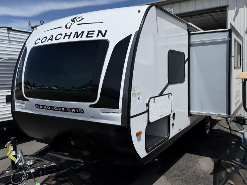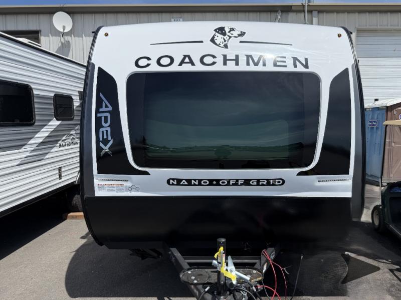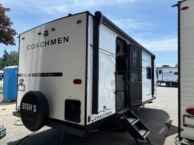 Coachmen Apex Nano travel trailer 190RBS highlights: Rear Full Bath Queen-Size Bed Booth Dinette Slide Pass-Through Storage 8 Cu. Ft. 12V Refrigerator Whether you camp with friends, family or solo, this trailer gives you space for all with a spacious main living and kitchen area thanks to the booth dinette slide! The rear full bath offers a shower, sink, toilet and a wardrobe so you can get ready in privacy. A two burner cooktop and microwave underneath will let you make meals each day, and the 12V refrigerator will be perfect for perishables. The walk-around queen-size bed provides convenience when getting in and out of bed and there are two wardrobes and overhead cabinets to keep your belongings up and away. The power awning protects you from the elements when relaxing outside, and the exterior pass-through storage gives you a place to stow the outdoor equipment like camping chairs, tables, fishing poles and charcoal. You will find comfort, convenience, and a sturdy construction with each of these Coachmen RV Apex Nano travel trailers! They are held together with an aluma-cage construction, an I-beam chassis, plus vacuum-bonded laminated dual Azdel fiberglass walls for double the protection against the elements. The 200-watt solar panel with a 30 amp control charger is included within the Off-Grid Package, along with two 20 lb. LP tanks, a high velocity power roof vent, plus 12V outlets to keep you powered up. More exterior features include a hot/cold shower, four stabilizer jacks, a power awning with LED lighting, and magnetic baggage door catches to easily pack and unload your gear. You will love the interior of your Apex Nano with Congoleum residential flooring, one-piece seamless edge countertops, matte black hardware in the galley, and a hand-crafted wood medicine cabinet in the bath.
