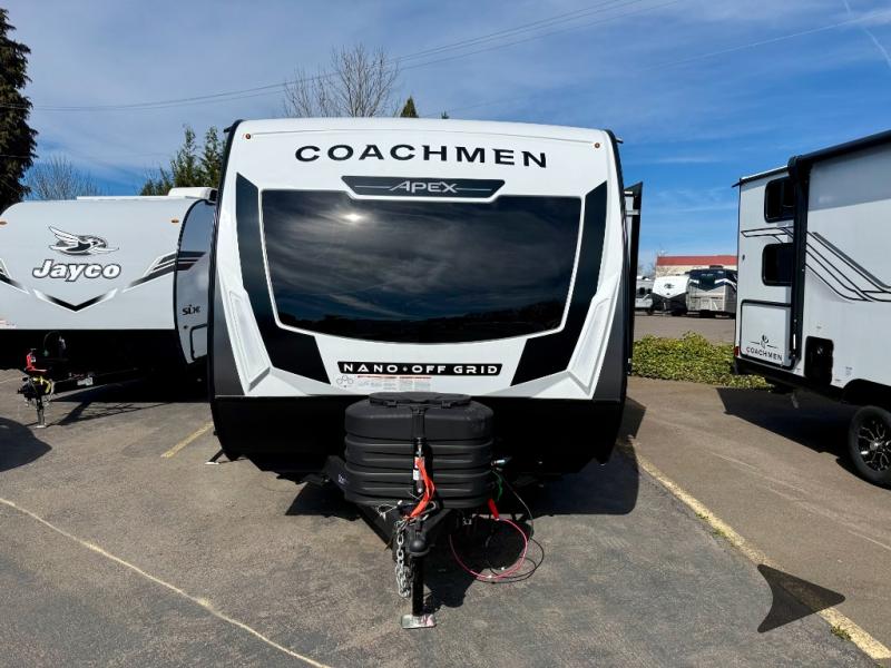 Coachmen RV Apex Nano travel trailer 208BHS highlights: Front Queen Bed, Booth Dinette Slide, Rear Corner Bathroom, Exterior Camp Kitchen, Pass-Through Storage. You and a few friends or family members can camp comfortably in this travel trailer! It features a front queen bed with wardrobes on either side to keep your clothes out of the way or you can switch it out for the optional Murphy bed for more versatility. Two others can sleep on the rear corner upper double bed and lower flip up double bed. After you have fried up some eggs on the two burner cooktop and heated up a piece of banana bread in the microwave, you can head to the booth dinette slide to enjoy it. There is even a pantry to store your coffee grounds and snacks. Now that your bellies are full, you can freshen up in the rear corner bathroom with the tub/shower. You will find comfort, convenience, and a sturdy construction with each of these Coachmen RV Apex Nano travel trailers! They are held together with an aluma-cage construction, an I-beam chassis, plus vacuum-bonded laminated dual Azdel fiberglass walls for double the protection against the elements. The 400-watt solar panel with a 30 amp control charger is included, along with two 20 lb. LP tanks, a high velocity power roof vent, plus 12V outlets to keep you powered up. More exterior features include a hot/cold shower, four stabilizer jacks, a power awning with LED lighting, and radius thumb latch baggage doors to easily pack and unload your gear. You will love the interior of your Apex Nano with Congoleum residential flooring, one-piece seamless edge countertops, matte black hardware in the galley, and a hand-crafted wood medicine cabinet in the bath.