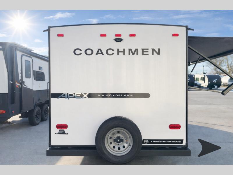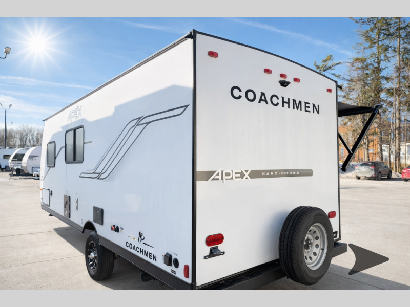 Coachmen RV Apex Nano travel trailer 183BH highlights: Camp Kitchen, Pass Through Storage, Rear Corner Bathroom, 10 Cu. Ft. Refrigerator. As you step into this versatile travel trailer, you'll be greeted by a front Murphy bed that offers the best of both worlds, a comfortable place to sleep at night and a cozy sofa for daytime lounging. Convenient storage is provided with a wardrobe at the foot of the bed and a nightstand on the other side for your essentials. In the center, the kitchen is fully equipped with a 10-cu. ft. refrigerator, a 2-burner cooktop, and an air fryer microwave, giving you all the tools you need to prepare your favorite meals. Across from the kitchen, a counter with chairs offers a welcoming space to dine, work, or gather. Toward the rear, double bed bunks provide additional sleeping space, with the lower bunk flipping up to reveal extra storage for your gear. Rounding out the layout is a full bathroom in the rear corner, featuring a tub/shower combo so you can enjoy the comfort and convenience of bathing right inside your trailer. You will find comfort, convenience, and a sturdy construction with each of these Coachmen RV Apex Nano travel trailers! They are held together with an aluma-cage construction, an I-beam chassis, plus vacuum-bonded laminated dual Azdel fiberglass walls for double the protection against the elements. The 400-watt solar panel with a 30-amp control charger is included, along with two 20 lb. LP tanks, a high velocity power roof vent, plus 12V outlets to keep you powered up. More exterior features include a hot/cold shower, four stabilizer jacks, a power awning with LED lighting, and radius thumb latch baggage doors to easily pack and unload your gear. You will love the interior of your Apex Nano with Congoleum residential flooring, one-piece seamless edge countertops, matte black hardware in the galley, and a hand-crafted wood medicine cabinet in the bath.