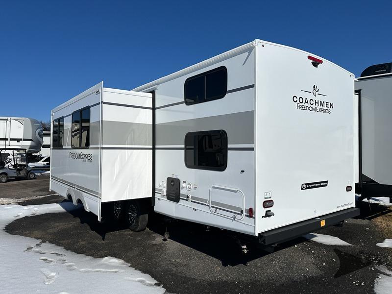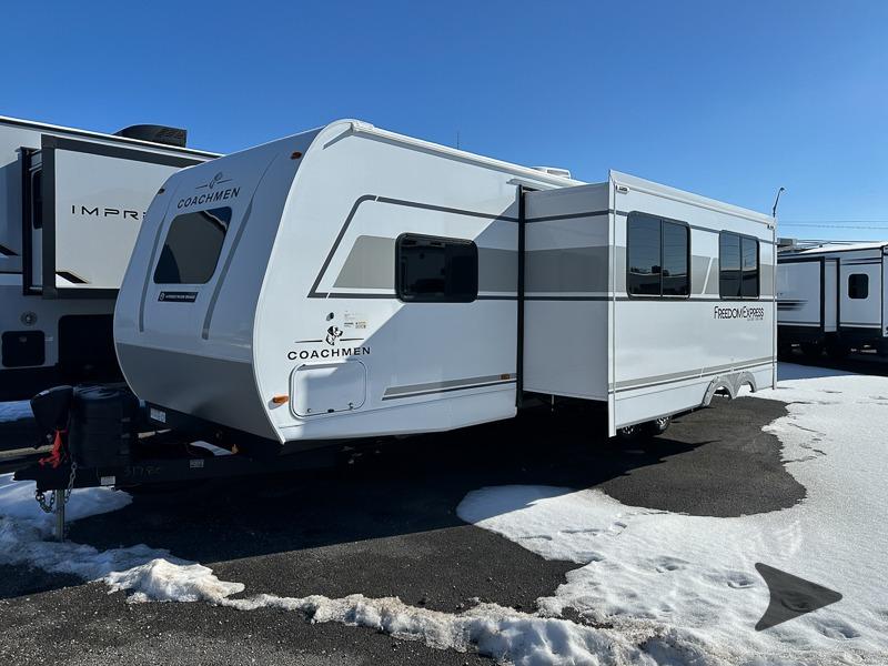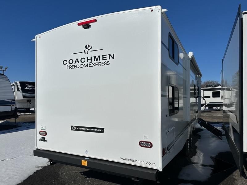 Coachmen Freedom Express Select travel trailer 29SE highlights: U-Shaped Dinette, Exterior Storage, Full Bath, Underbed Storage. Whole-family fun is waiting for you in this spacious travel trailer. The kids or your guests will love the private bunkhouse with four bunks, plus a wardrobe with a countertop to keep their things. You will enjoy the front private bedroom with a walk-around queen bed and dual wardrobes, and if you have any other guests, they can sleep on the sofa or U-shaped dinette within the large slide out. The kitchen includes everything needed to prepare meals each day, including a microwave, a dual-burner cooktop, and a double door refrigerator. This model also includes a pass-through storage, plus additional exterior storage to bring along hiking gear, fishing poles, and camp chairs! With any Freedom Express Select travel trailer by Coachmen you will find an alumicage construction and two-step vacuum bonded and pinch rolled sidewalls with Azdel interior and exterior for a trailer made to last. These Select value models come standard with a Bluetooth interior speaker, night shades, and wear-resistant vinyl flooring throughout. You will appreciate the power tongue jack, as well as the Dicor Tufflex PVC roof and heated and enclosed underbelly to help with protection and climate control. A GE 15K BTU roof A/C will keep you comfortable, and the suburban tankless water heater will provide endless hot showers!