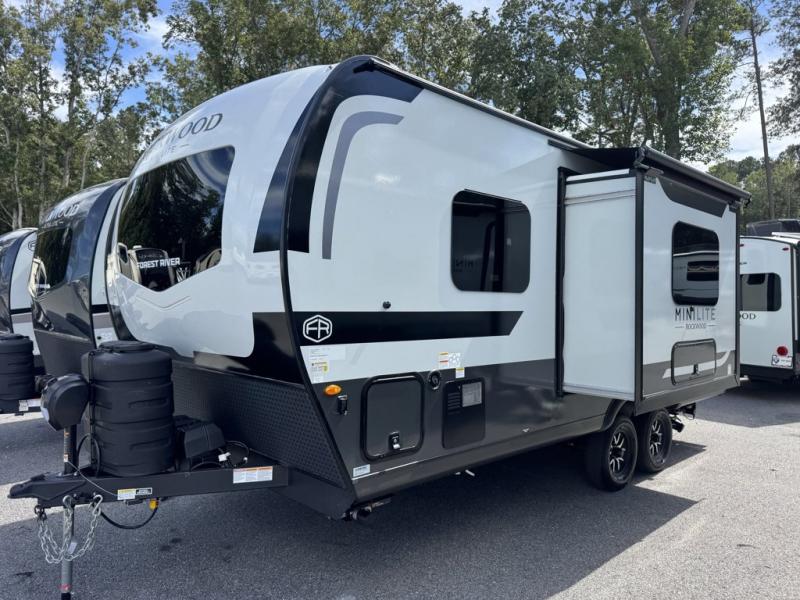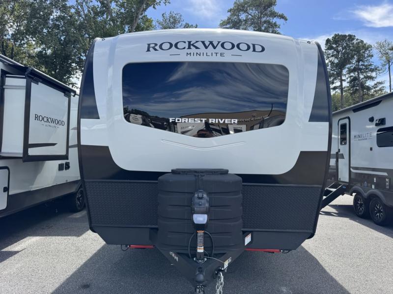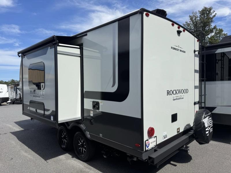 Forest River Rockwood Mini Lite travel trailer 2109S highlights: Microwave Oven, Semi-Private Front Bedroom, Radius Shower with a Skylight, 72" Sofa Slide, Flip-Up Storage. Wherever you decide to camp, you will love every minute in this cute couple's trailer. The sofa slide with a table will provide a place to relax, eat, and even sleep an extra guest if you have one, and the front RV queen bed includes a privacy curtain to enjoy your own space. There are dual bedroom wardrobes to keep your clothes tidy, and you'll find two pass-through storage compartments for your larger gear. An outside griddle with an LP hookup will allow you to make breakfast outdoors, and there is a three burner cooktop indoors if the weather isn't cooperating. Since there is a full bath on board you won't have to use the camp's facilities, and you can make it a movie night with the 32" TV in the main living area! Each Rockwood Mini Lite travel trailer by Forest River is constructed with a fully laminated one-piece walkable roof, sleek frameless windows, and a six-sided full aluminum frame for strength and durability. The 12V thermostatically controlled heated tanks, plus radiant foil in the underbelly will allow you to camp well into the colder months, and the 200W roof solar panel will be perfect for a little off-gridding. Each model includes solid surface kitchen countertops, hidden hinge cabinet doors, roller shades, plus many more interior features. Having an Air 360+ omnidirectional antenna with WiFi prep on board gives you the option to get some work done if it's needed, and the power tongue jack provides hassle-free set up, so you can enjoy more time relaxing!
