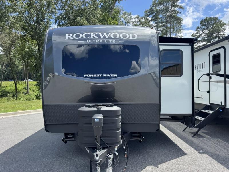 Forest River Rockwood Ultra Lite travel trailer 2608BS highlights: Front Kitchen, Dual Entry, Fireplace, Spacious Rear Bedroom, Exterior Storage. When you are outside this trailer you can enjoy the protection from the 21' power awning, and whip up a meal using the outside griddle. You will find exterior storage for your extra gear, and a ladder at the rear. You get to choose which entrance to step up into, be it the spacious rear bedroom with a queen bed slide and a wardrobe, or the main entry into the kitchen and living area. The furniture slide includes a booth dinette to eat your meals at, and theater seating to watch the Smart TV with a fireplace below. And the cook will love the front kitchen with extra counter space, a three burner range, plus a 12V refrigerator and pantry for food storage! Each Rockwood Ultra Lite travel trailer by Forest River includes superior construction with a high gloss front cap, laminated white fiberglass sidewalls, and tinted frameless windows for a sleek look. The torsion axle, Rubber-Ryde suspension will make towing smooth and hassle-free, along with the nitrogen filled, Goodyear Endurance tires and the tire pressure monitor system. Interior comforts include designer kitchen backsplash, solid wood cabinet doors with hidden hinges, and night roller shades to name a few. Choose a Rockwood Ultra Lite travel trailer today!