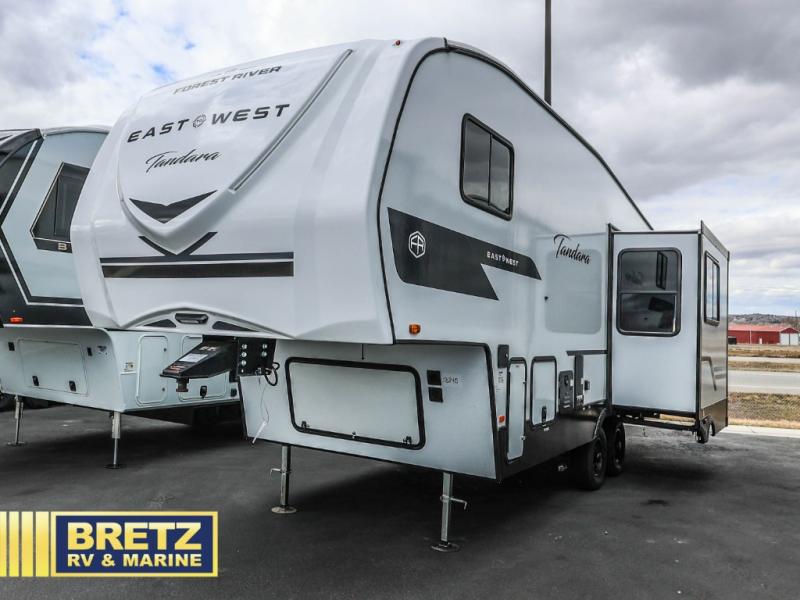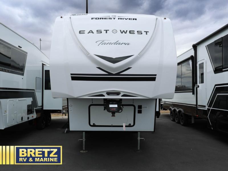 The options and features listed can vary and are based on manufacturer data when built. For an accurate list please contact the dealer. See disclaimer at the bottom of page. EAST TO WEST Tandara half-ton fifth wheel 235ML highlights: Rear Kitchen, Booth Dinette, King Bed, Exterior Power Awning. Get ready for adventures with a fifth wheel that is perfect for exploring. This compact vehicle combines comfort and functionality for the ultimate getaway. The rear kitchen is a culinary haven, so you can cook up a storm on the range, stash gear in the overhead cabinet, and wash up at the sink. Keep drinks cold in the 12V fridge, enjoy meals in the cozy booth dinette, and stock up in the pantry. The hide-a-bed sofa is a comfy spot to chill and sleep. The full bathroom is a refreshing oasis where you can get ready for the day or unwind after a big adventure. Store essentials in the closet. The front bedroom is a peaceful retreat with a king bed and nightstands on each side of the bed. The 14'6" awning is perfect for outdoor chilling and enjoying the view. With any Tandara fifth wheel by EAST TO WEST, you will enjoy many standard features to make each trip enjoyable. The Tandara Packages includes an Azdel laminated sidewalls, and LED lighting features adding convenience to every trip. You will also appreciate the ductless flooring, dual attic vents, plus a heated and enclosed underbelly for added protection. Inside, you'll find an on-demand tankless water heate r, luxurious interior decoration, and more stand-out features included to make you feel right at home!