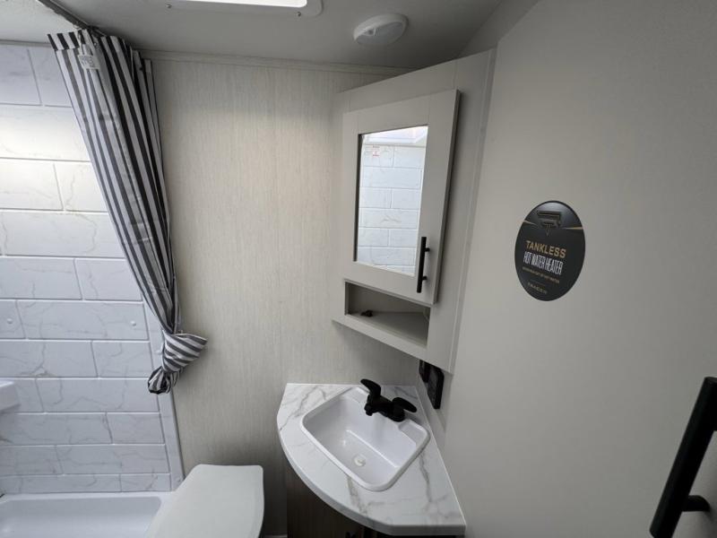 Prime Time Tracer Touring Edition travel trailer 195RB highlights Jack Knife Sofa, Pass-Thru Storage, Full Bath, King Bed, Exterior Fridge. This travel trailer features an array of premium amenities! The spacious full rear shower provides a rejuvenating retreat, perfect for unwinding after a long day. The sophisticated entertainment center is ideal for cozy nights in, and the plush jackknife sofa offers a comfortable spot to relax or sleep. Generous storage space for your belongings is provided by ample overhead cabinets. Further, the gourmet kitchen is equipped with a convenient side 12V fridge, high-performance three-burner cooktop, and cleverly designed hidden pantry, making meal prep and cooking a true delight. Plus, the majestic front bedroom features a sumptuous king bed that will make you feel like you are sleeping in the clouds, expansive wardrobes, and overhead cabinets for storing your essentials. The Prime Time Tracer travel trailers are ultra lightweight for an easier tow! They are built with solid construction materials so you can enjoy camping and making memories for years to come. Interior luxuries are easy to find with full bath and kitchen amenities, comfortable sleeping and seating spaces, plus ample storage space for your personal belongings and camp gear!