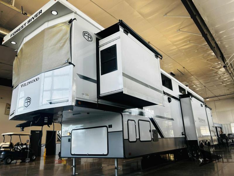Forest River Wildwood Heritage Glen fifth wheel ROOST43 highlights: Residential Kitchen Appliances, Two Lofts, Bath and a Half, Kitchen Island, Triple Patio Doors, Dual Outdoor Refrigerators, Dune Interior Decor, Expedition Package, Elevated Value Package and more. Introducing a new RV of its kind, the ROOST43 is a destination-style fifth wheel you are sure to love! There are two levels, making it feel more like home, and you can sleep six to eight each night. The master bedroom includes a custom king bed slide out, a 32" TV and fireplace, a desk/vanity, plus a half bath for convenience. A custom king-size bed is also found in the front loft, and there are storage cubbies plus a coax/110V outlet here to plug in chargers or a laptop. The second loft in the back includes spiral stairs, two bunk mats, a wardrobe, and cubby cubes here also for your guests' things. Some of the stand-out features you'll find on the first level are the sectional sofa with a coffee table, an entertainment center with a 65" TV, a kitchen island with five chairs, and a fully-equipped kitchen. The 20 cu. ft. 12V refrigerator and pull-out pantry will let you stock up on food, and the kitchen hutch will be perfect for nice dishes. The full bath on this model is one to remember; there is a one-piece fiberglass shower with a teak seat, a flip-up shelf and a washer/dryer, a backlit mirror, and more. And we haven't even touched on the exterior features, such as the pull-out tray, outdoor refrigerators, 20' awning, and more! The Wildwood Heritage Glen ROOST fifth wheels resemble a destination trailer that will be giving you residential vibes! The premium Alley Grey high-gloss gel coat fiberglass sidewalls are ultra sleek, and the flat pitched roof sheds water to the off-door side for added comfort. A Race Track A/C duct system provides maximum cooling, and the AccessiBelly underbelly with 12V tank heaters on all holding tanks will help extend your camping season. There are high-end solid surface and maple-stained wood countertops inside, along with residential-inspired wood door casings, and 6' 8" clearance in all rooms, excluding lofts. Additional features include a Gun Metal grey kitchen sink, backlit mirrors in the bathrooms, motion sensor lights by the spiral stair cases, and back up camera prep if you want the option to make parking easier than ever.