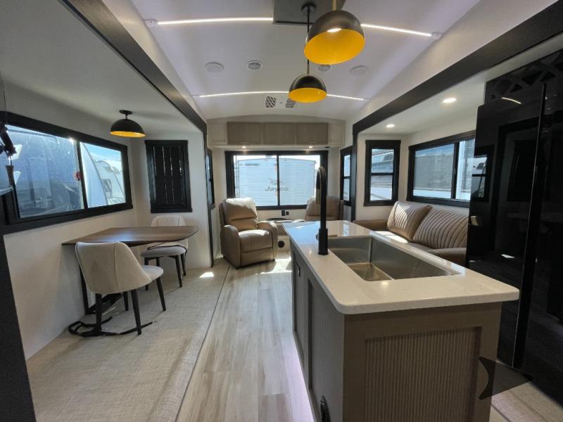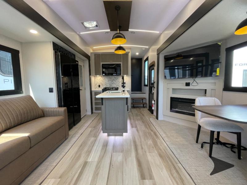 Forest River Wildwood Heritage Glen fifth wheel 286RL highlights: Two Lounge Chairs, Kitchen Island, Residential Walk-In Shower, Custom King Bed, Panoramic Windows, and 13' Awning. Whether you enjoy being outside or inside, this Wildwood Heritage Glen fifth wheel gives you the best of both! Imagine relaxing in a chair or on the tri-fold sofa and being able to look out panoramic windows at the scenery. Or, you might like to watch a show on the 50" LED TV with a fireplace below, and you can dine at the table and chairs that allows you to move the chairs if needed. The 16-cubic foot 12V refrigerator next to the pantry will allow you to stock up on ingredients and cold beverages for a long trip, and you will appreciate the custom king bed slide and the residential walk-in shower after being outside all day, even if just under the 13' awning. There is plenty of storage in the master bedroom and throughout, plus the XL Texas size pass-through compartment will surely come in handy for your charcoal, outdoor games, and such. With any Wildwood Heritage Glen fifth wheel by Forest River, the quality construction, attention to detail and design along with a bright and welcoming interior allows you to relax in comfort with conveniences while exploring outdoors. The Summer Wind colored horizontal plank linoleum flooring is unique, beautiful and durable, and there are gold-accented faucets with stainless steel sinks in the bathrooms for added luxury. The Accessibelly underbelly with 12V tank heaters will help protect your unit from the elements, and the power stabilizer jacks and landing gear will make set-up a breeze. More features that provide convenience include the high-end solid surface countertops, an RV Airflow System that provides at least 25% better airflow, and solar prep for off-grid capabilities.