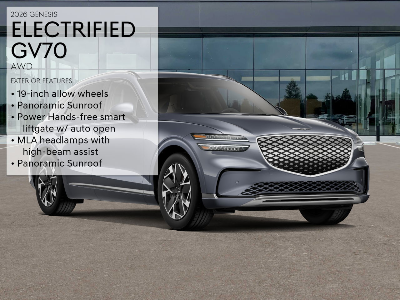 The 2026 Genesis Electrified GV70 19 AWD offers a blend of luxury, performance, and advanced technology. With a spacious interior, sophisticated design, and a suite of driver assistance features, this all-electric SUV is designed for comfort and safety. Enjoy the benefits of a quiet, smooth ride and impressive acceleration, all powered by an electric motor.