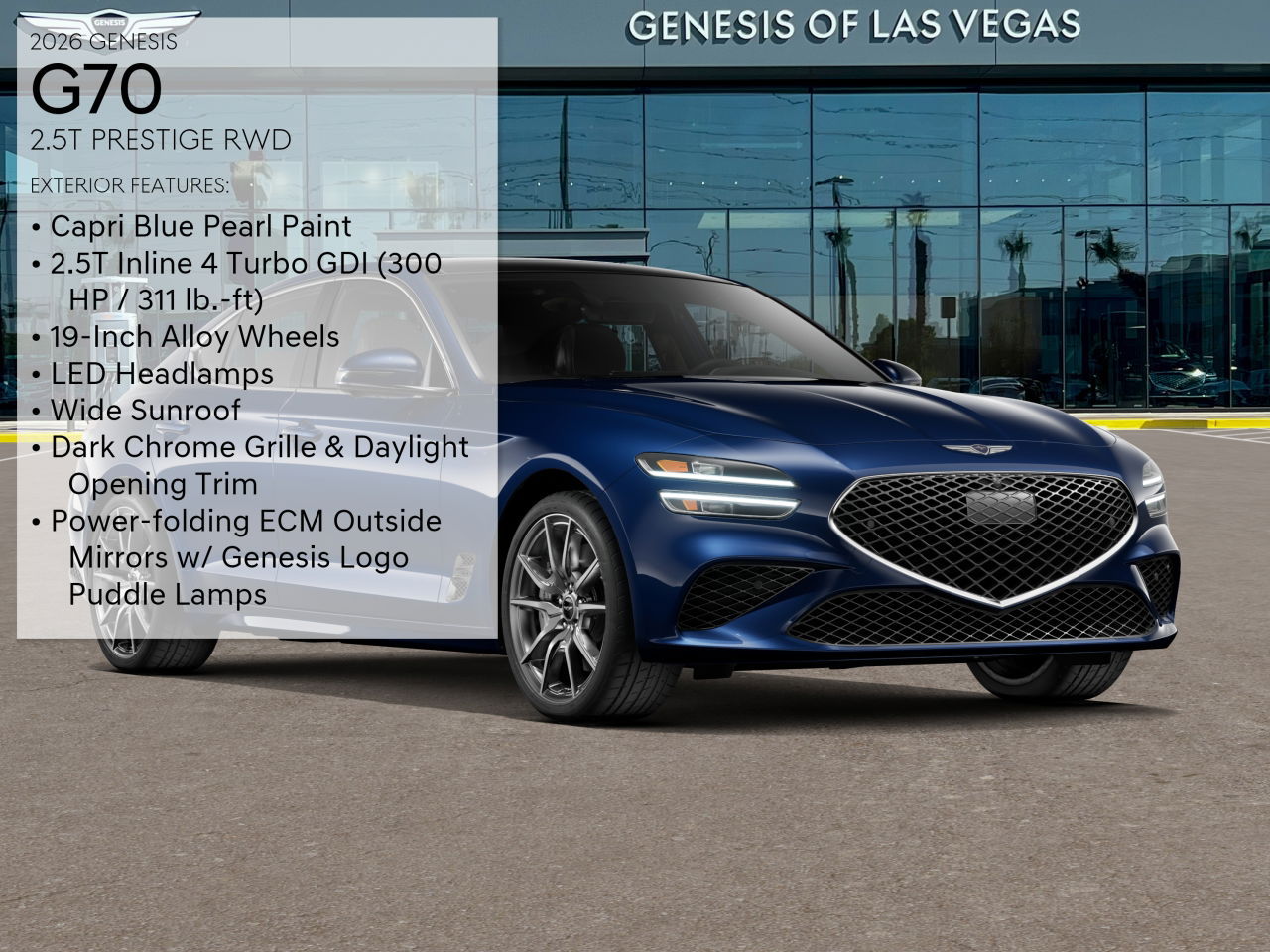 The 2026 Genesis G70 2.5T Prestige is a new, in-transit luxury sedan featuring a 2.5L I-4 turbocharged engine and rear-wheel drive. This vehicle offers a premium driving experience with a focus on comfort, technology, and performance. The interior is designed for longevity and comfort, while the exterior showcases a sophisticated Capri Blue color. The G70 combines advanced safety features, a refined audio system, and a suite of connectivity options for a truly modern driving experience.