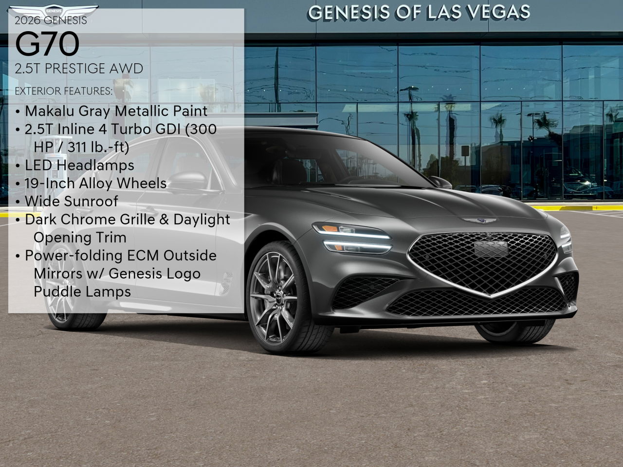 The 2026 Genesis G70 2.5T Prestige AWD is a new luxury sedan in transit at Genesis of Las Vegas. It features a 2.5L I-4 turbocharged engine with all-wheel drive and a host of premium amenities. The G70 offers a refined driving experience with a focus on comfort, technology, and performance, making it an excellent choice for those seeking a well-built, well-appointed sedan.