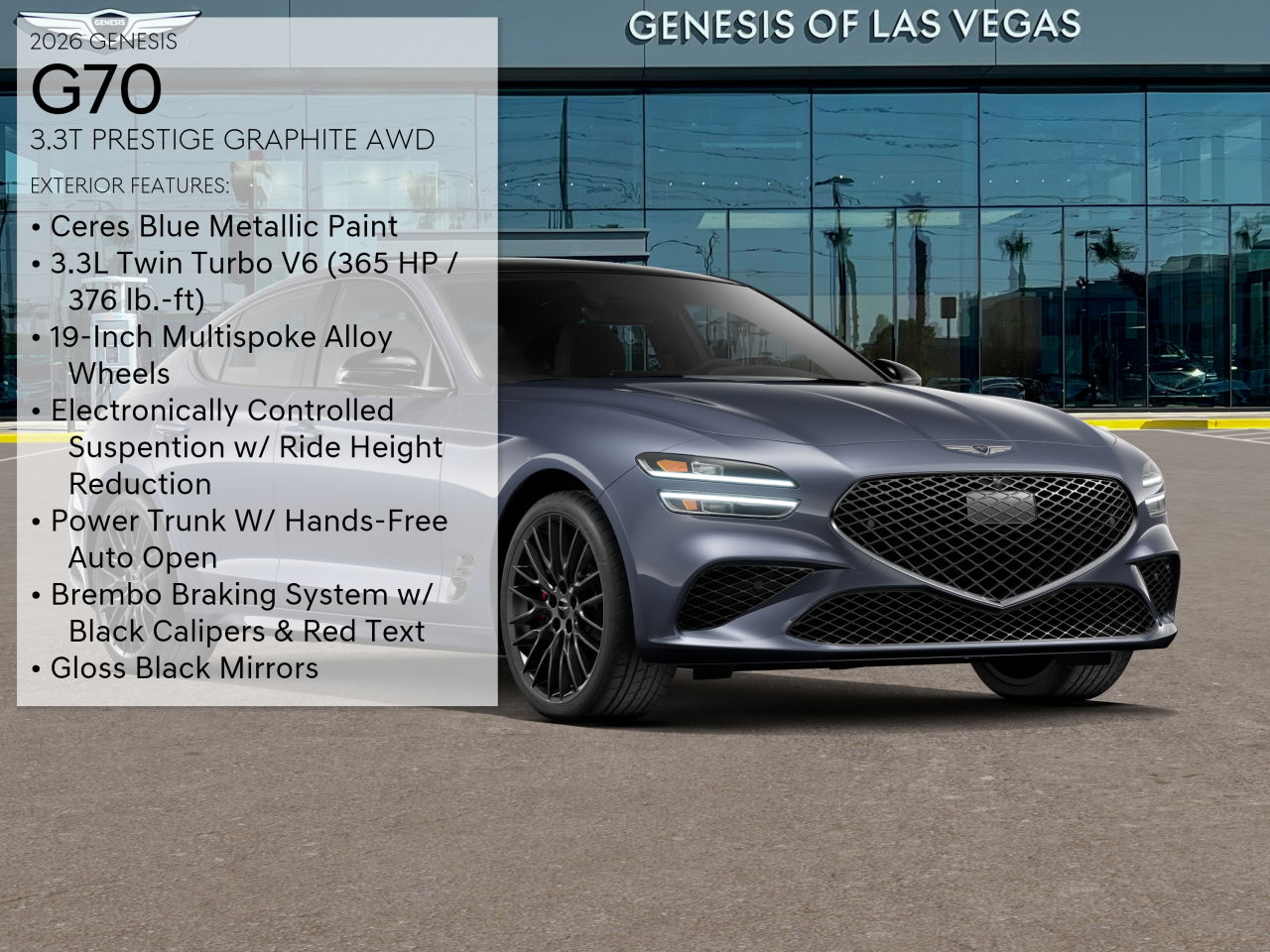 The 2026 Genesis G70 3.3T Prestige Graphite is a new, in-transit luxury sedan at Genesis of Las Vegas. This AWD vehicle features a turbocharged 6-cylinder engine and a host of premium amenities. The G70 offers a refined driving experience with advanced technology, a spacious interior, and a suite of safety features. Enjoy the latest in Genesis Complete Confidence Warranty and exclusive offers.
